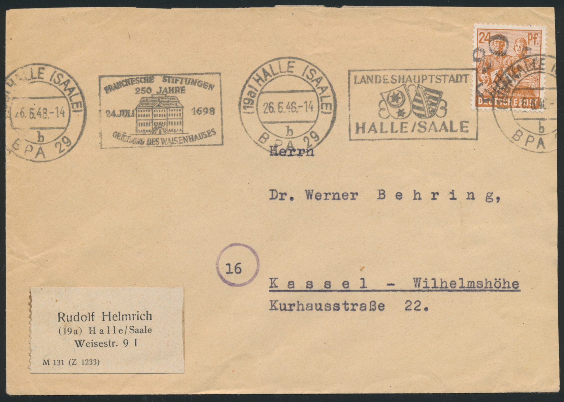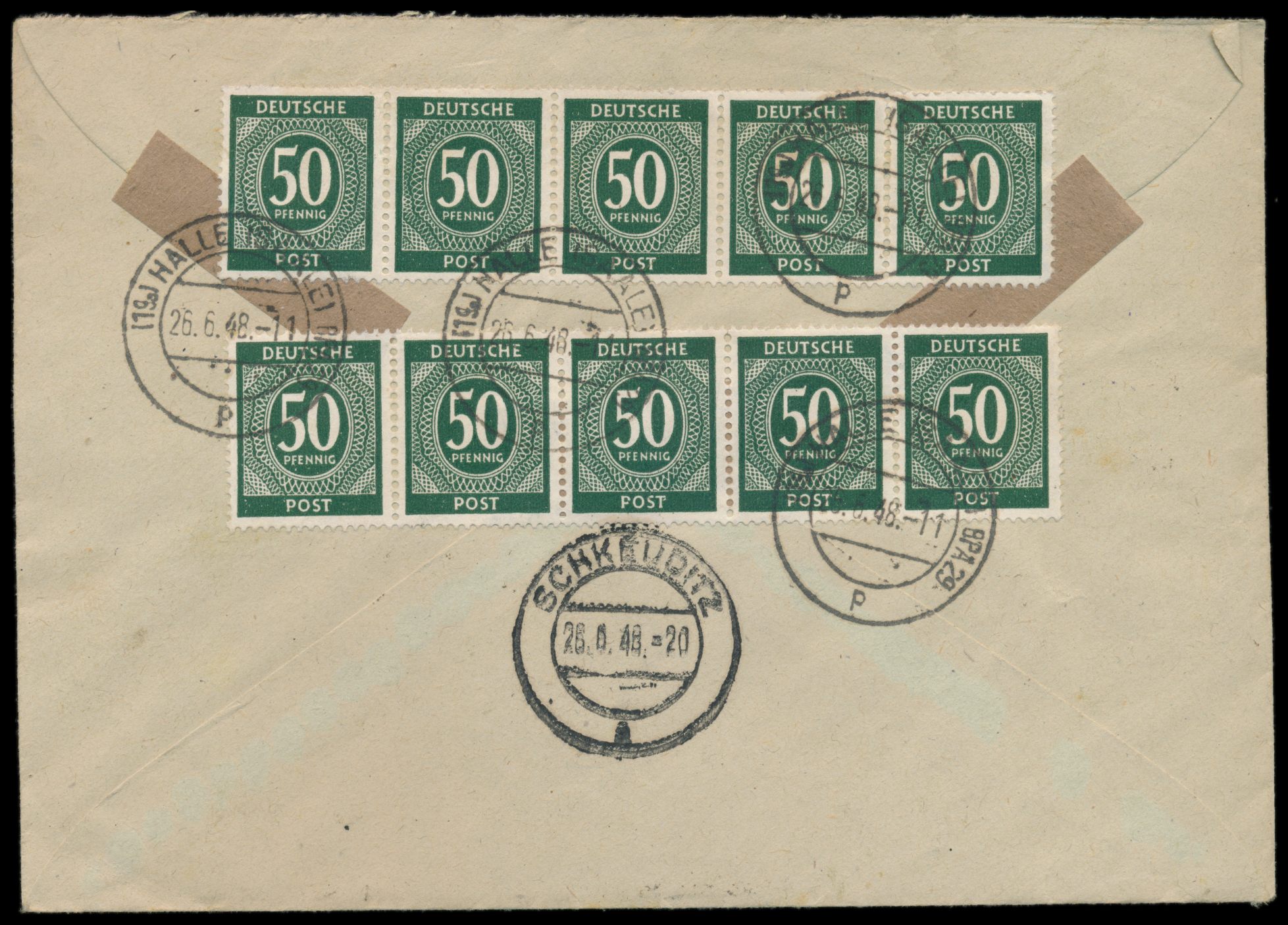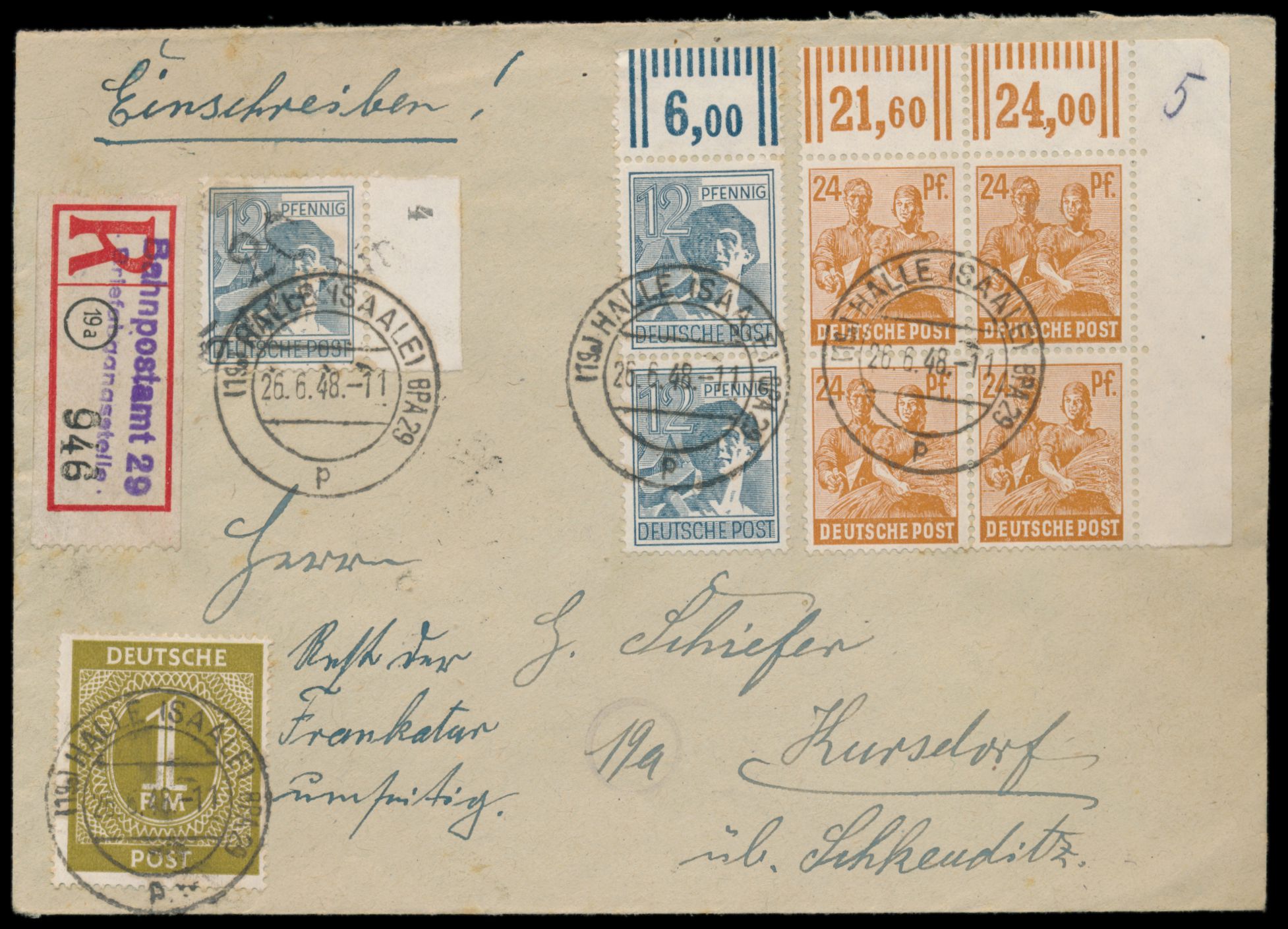 Bezirkshandstempel 20 Schkeuditz auf 12 Pf. als Zehnfach-Mischfrankatur mit 10 x 50 Pf. und 1 RM Ziffer, 2 x 12 Pf. und 24 Pf. Arbeiter auf Einschreibbrief, Stempel Halle (Saale) BPA 29 26.6.48, Blanko-R-Zettel mit L2 "Bahnpostamt 29 / Briefabgangsstelle", nach Schkeuditz, Ankunftstempel 26.6.48, portorichtig