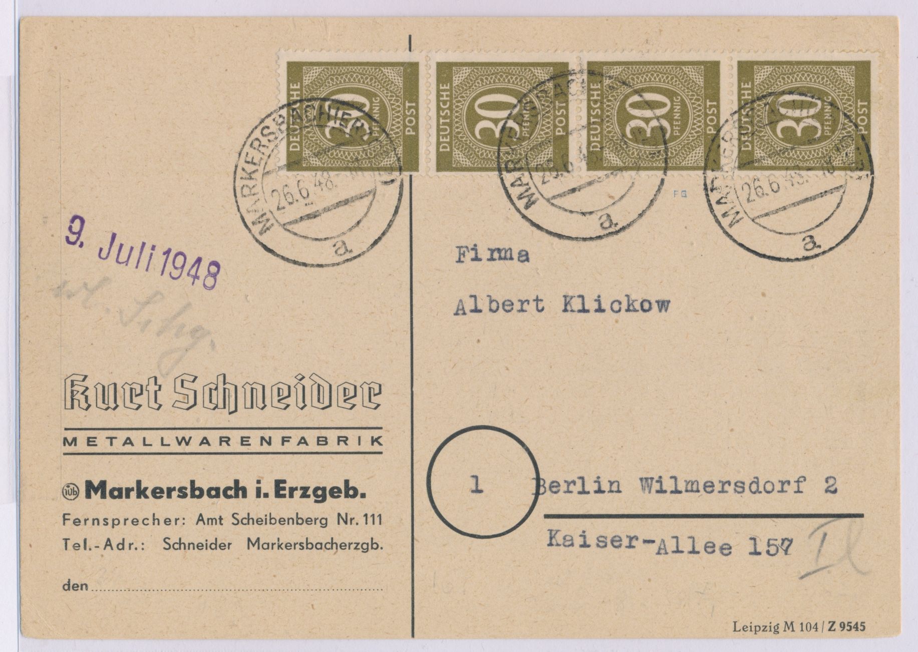 4 x 30 Pf. Ziffer als Zehnfachfrankatur auf Firmenkarte mit Stempel Markersbach (Erzgeb) 26.6.48 nach Berlin-Wilmersdorf, portorichtig, Bedarf