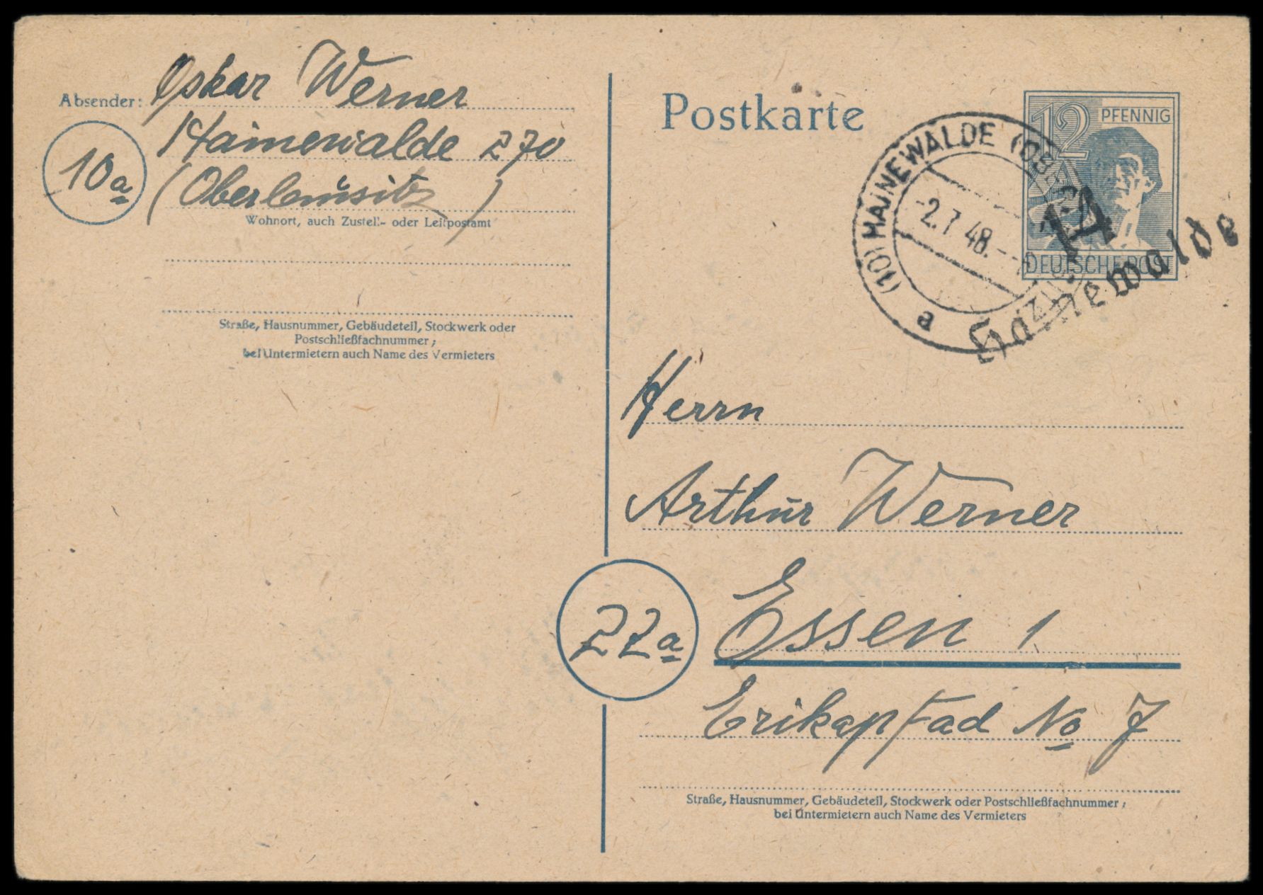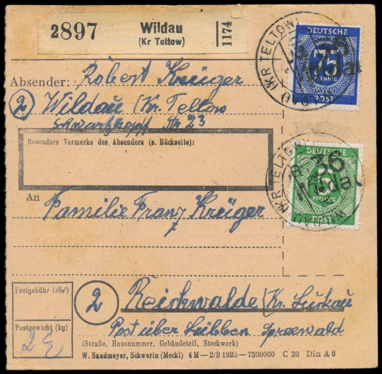 Bezirkshandstempel a 36 Wildau auf 5 Pf. und 75 Pf. Ziffer auf Paketkarte, Stempel Wildau (Kr. Teltow) 26.6.48, nach Reichwalde, handschriftlicher Zustellvermerk 28.6.48
