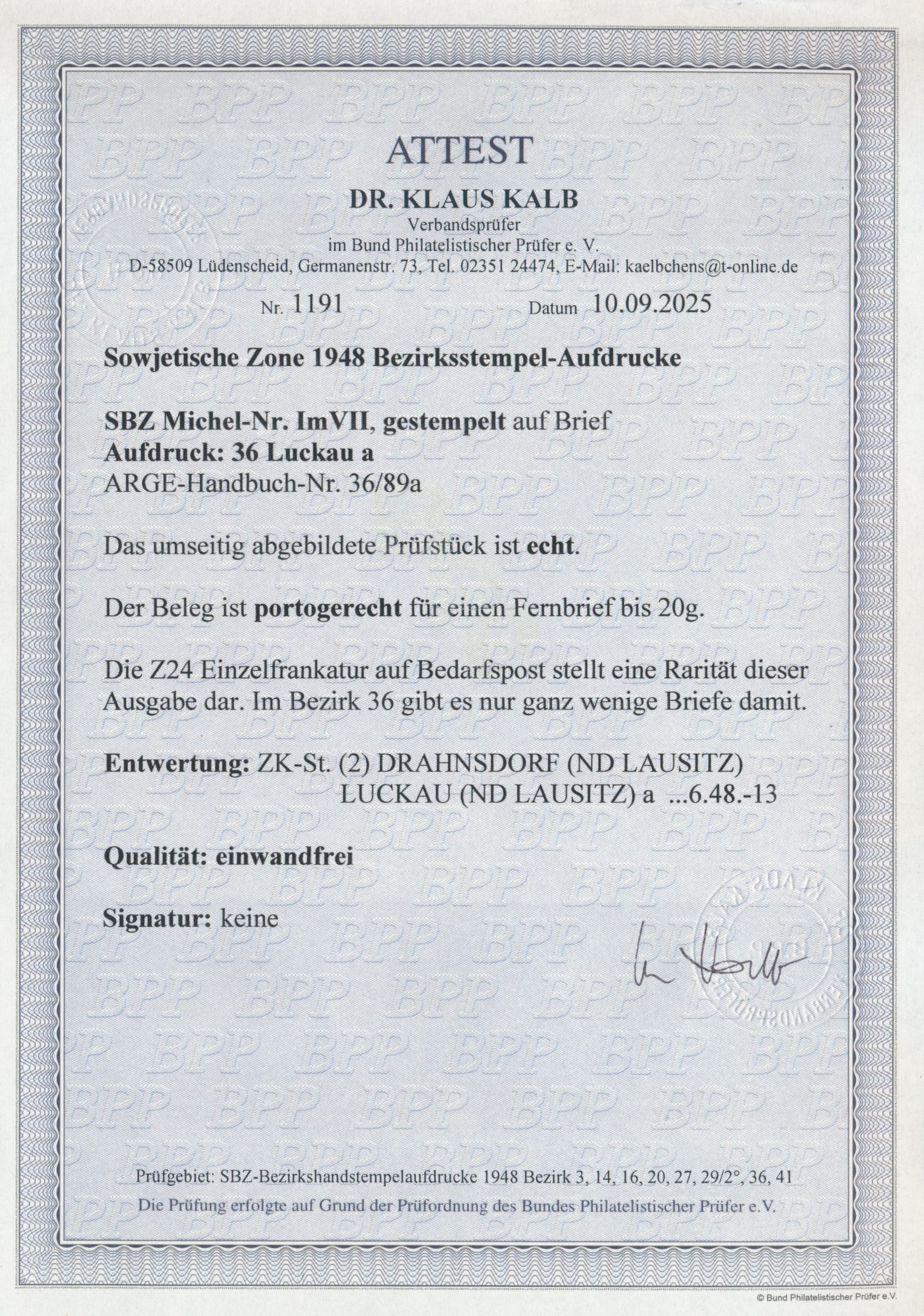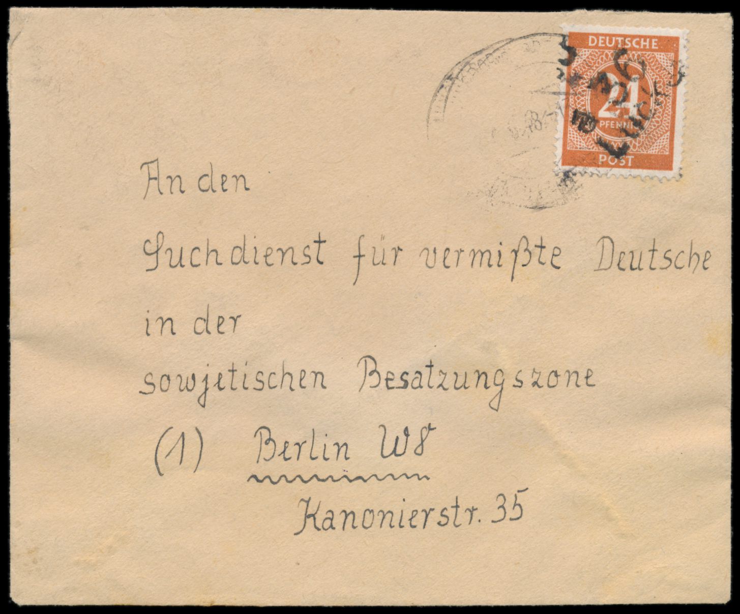 Bezirkshandstempel a 36 Luckau auf 24 Pf. Ziffer (aus Markenheftchen) auf Brief mit Stempel (2) Drahnsdorf (Nd Lausitz) / Luckau (Nd Lausitz) a ... 6.48, an den Suchdienst der SBZ in Berlin W 8, Bedarf, laut Foto-Attest Dr. Kalb BPP echt und einwandfrei, nur wenige Briefe aus dem Bezirk 36 mit 24 Pf. Ziffer bekannt