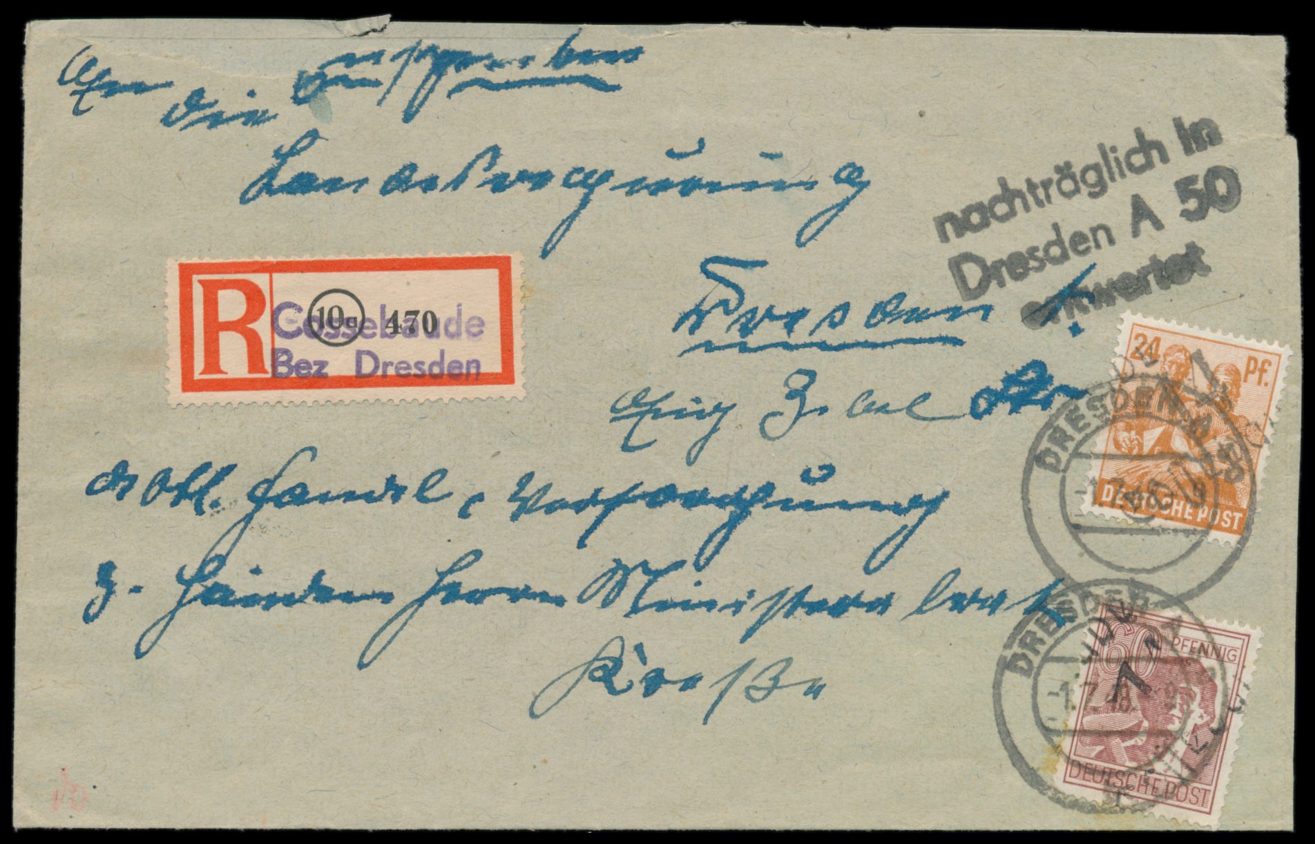 Bezirkshandstempel 14 Cossebaude auf 24 Pf. und 60 Pf. (kleiner Fleck) auf Einschreibbrief an die Landesregierung in Dresden, R-Zettel Cossebaude Bez. Dresden, Stempel Dresden A 50 1.7.48 und L3 "nachträglich in Dresden A 50 entwertet" , Bedarf