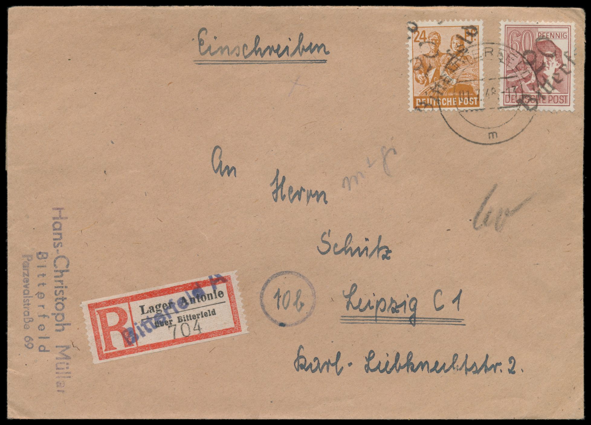 Bezirkshandstempel 20 Bitterfeld auf 24 Pf. (Typ b) und 60 Pf. (Typ a) auf Einschreibbrief mit Stempel Bitterfeld 1.7.48 nach Leipzig, R-Zettel Lager Antonie über Bitterfeld mit L1 Bitterfeld A überstempelt, Ankunftstempel 2.7.48, Bedarf