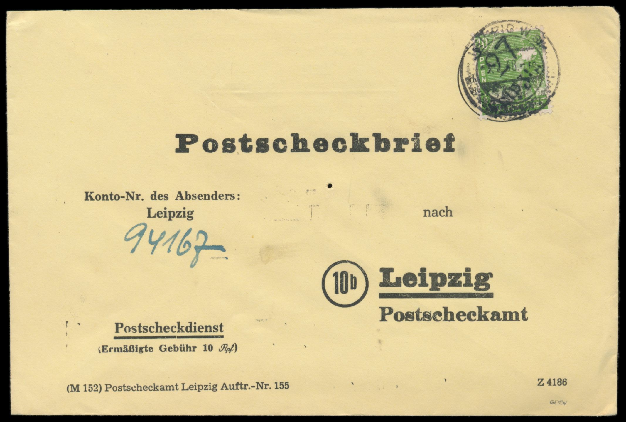 Bezirkshandstempel 27 Leipzig ... auf 10 Pf. als Einzelfrankatur auf Postscheckbrief an PSchA Leipzig, Stempel Leipzig W 8 3.7.48