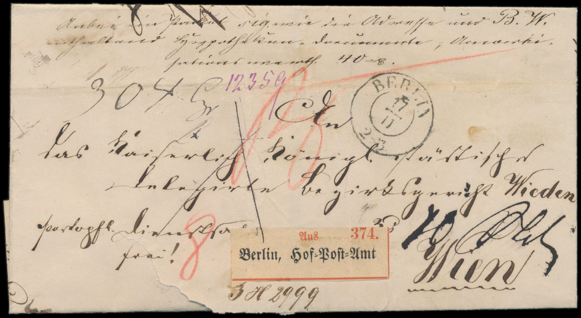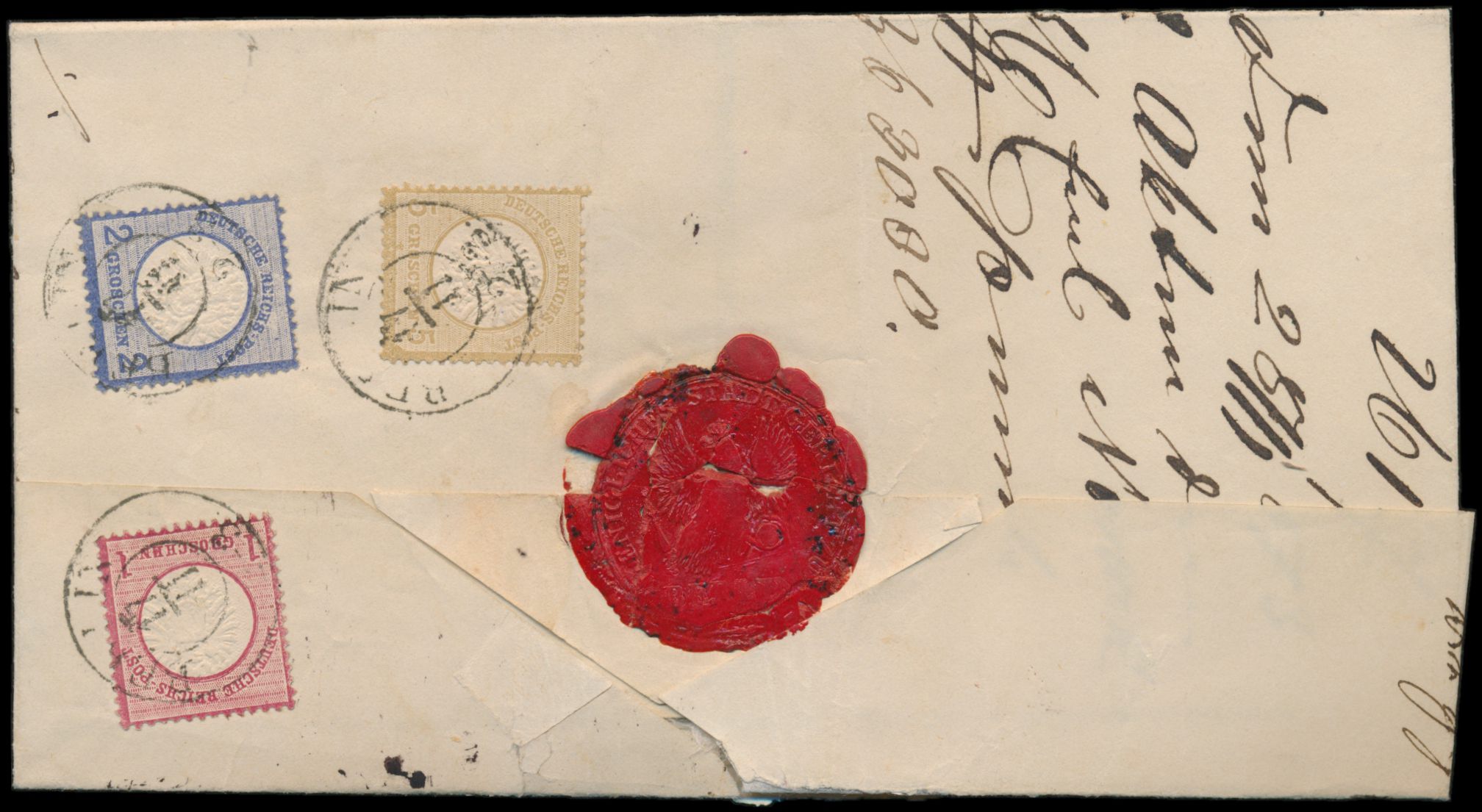 Brustschild 1 Gr., 2 Gr. und 5 Gr. (1 kurzer Zahn) rückseitig auf Paketbegleitbrief (Faltbriefhülle) mit als Entwertung sehr seltenem Preußen-K2 des Hofpostamt Berlin 17/11 (1872) nach Wien, Paketnummernzettel "Berlin, Hof-Post-Amt", Beleg hat handschriftliche Registriervermerke und vorderseitig 3 cm Einriss