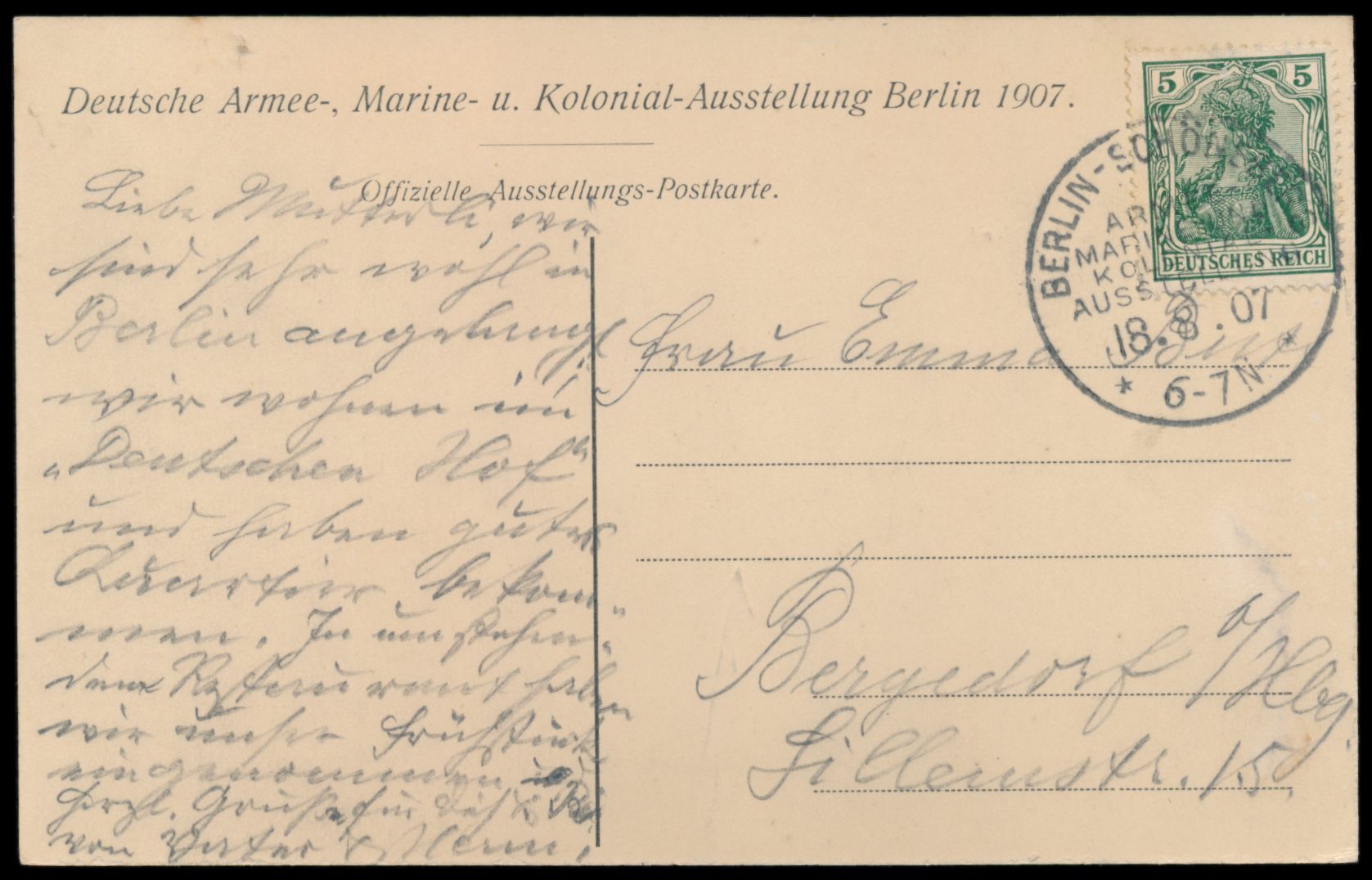 Berlin-Schöneberg Armee-, Marine und Kolonial-Ausstellung: zwei Ausstellungs-Ansichtskarten, Frankatur 5 Pf. und jeweils sauberer Sonderstempel 18.8.07, beide nach Bergedorf, Bedarf