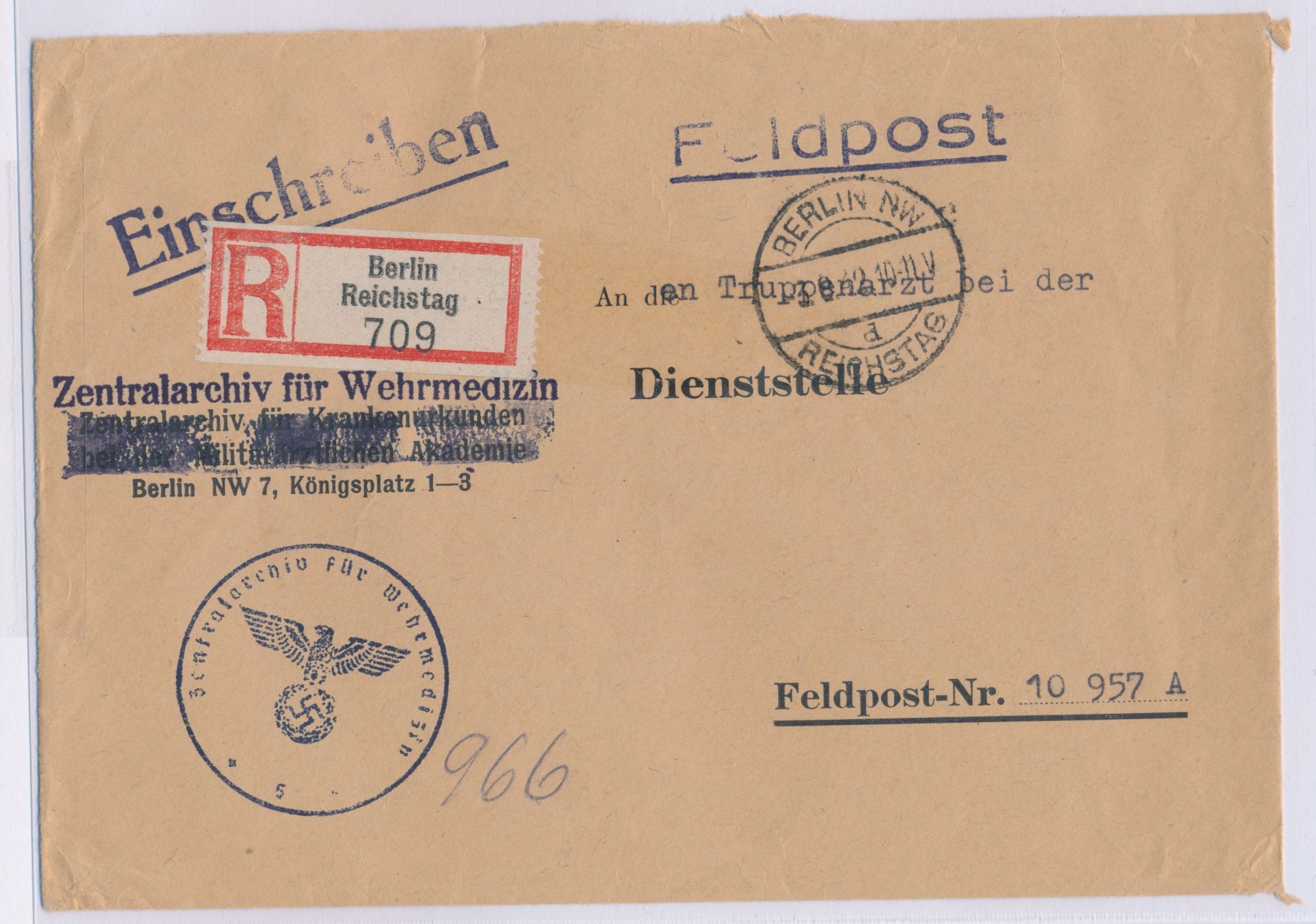Stempel Berlin NW Reichstag 3.8.42 und entsprechender R-Zettel auf Feldpost-Einschreibbrief des Zentralarchiv für Wehrmedizin an FPNr. 10957 A = Stab Reserve-Jäger-Bataillon 75