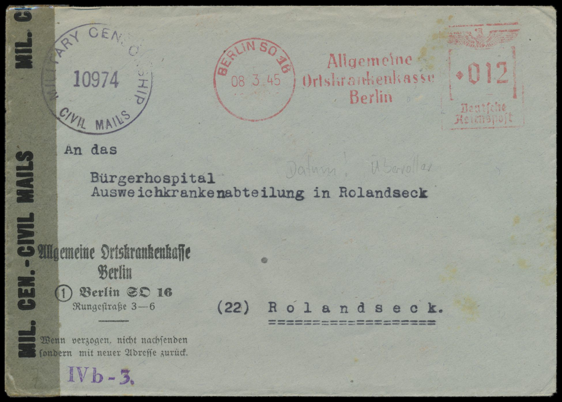 Absenderfreistempel Allgemeine Ortskrankenkasse Berlin, Berlin SO 16 8.3.45, Adlerkopf-Wertrahmen 012 Pf., Brief nach Rolandseck, "überrollt" , links Zellophanverschluß und Zensurstempel 10974 der US-Zensurstelle Offenbach