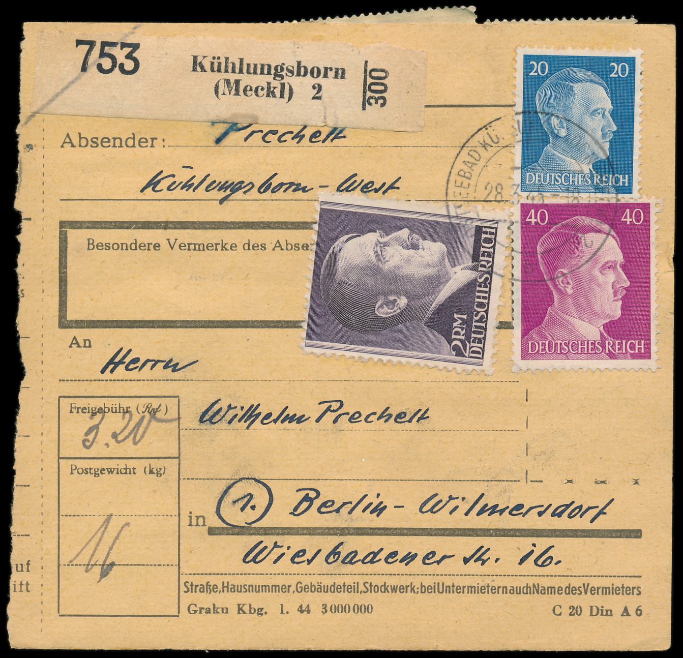 20 x 3 Pf. Hindenburg und 20 Pf., 40 Pf. und 2 RM Hitler beidseitig auf Paketkarte für ein Paket von 16 kg von Ostseebad Kühlungsborn nach Berlin, angegebene Gebühr 3.20 Pf., Stempel Ostseebad Kühlungsborn (Meckl) 2 28.3.45, handschriftlicher Zustellvermerk 9.4.(45), sehr spätes Datum für den Paketverkehr nach Berlin