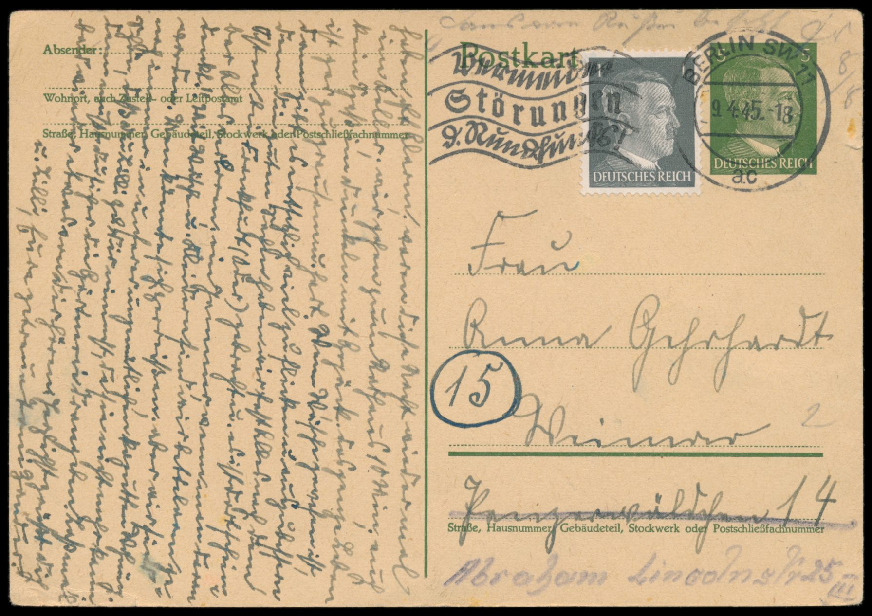 Ganzsache 5 Pf. Hitler mit Zusatzfrankatur 1 Pf., Maschinenstempel Berlin SW 11 9.4.45, nach Weimar, erst nach der Besetzung am 12.4.45 in Weimar angekommen, handschriftlich "Haus von Russen besetzt 8.8.(1945)" und handschriftlich umadressiert "Abraham-Lincoln-Str. ..." (umbenannt, vorher Adolf-Bartels-Straße), interessanter zeitgeschichtlicher Text "... Straßensperren ... Haben erneut Bombengeschädigte aus dem Norden Berlins ...", Bedarf
