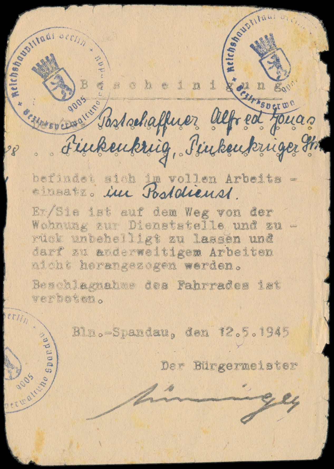 Bescheinigung der Bezirksverwaltung Berlin-Spandau für einen Postschaffner mit Datum 12.5.1945, Text: "... befindet sich im vollen Arbeitseinsatz. ... ist ... unbehelligt zu lassen und darf zu anderweitigen Arbeiten nicht herangezogen werden. Beschlagnahme des Fahrrads ist verboten ... Der Bürgermeister.", Unterschrift "Münsinger", leichte Randläsuren und gering fleckig, seltenes Dokument