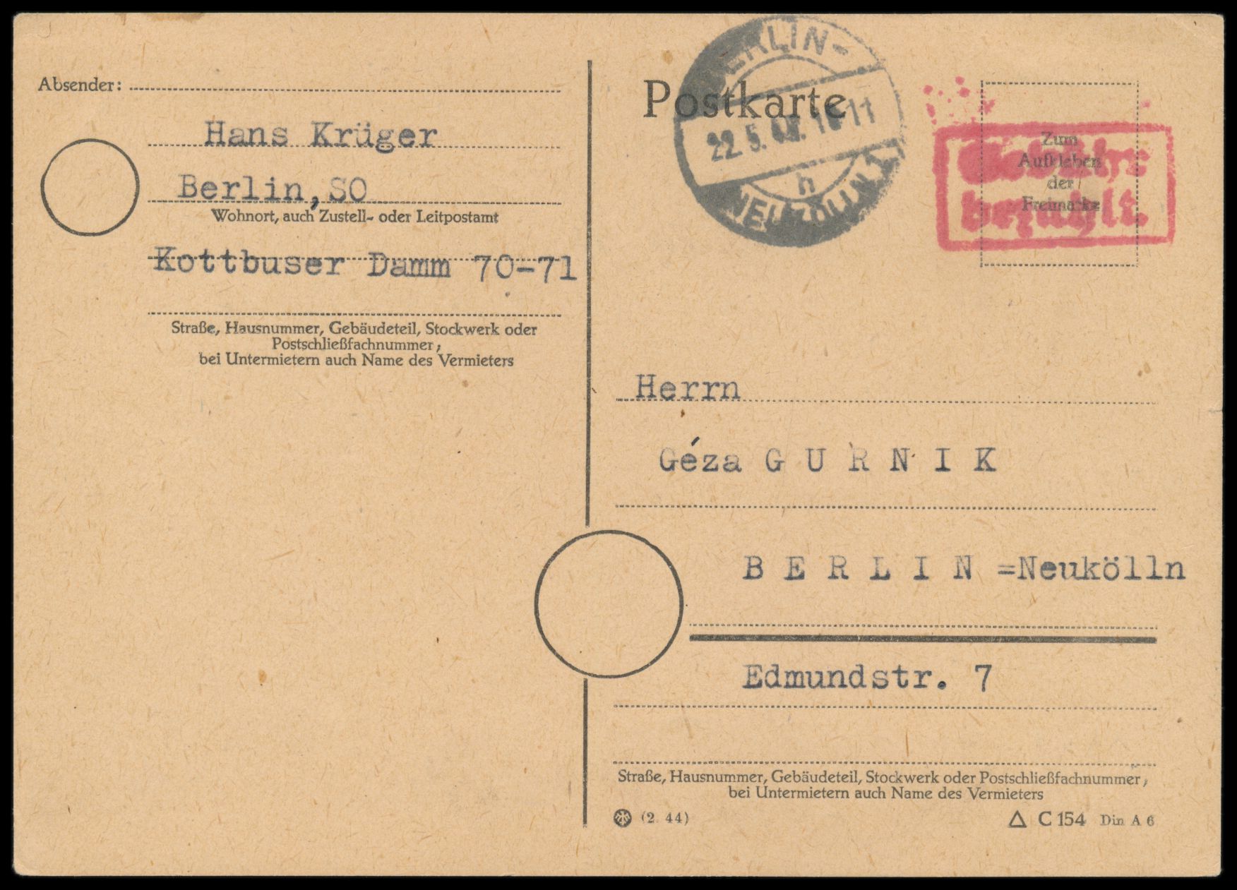 Stempel Berlin-Neukölln 1 h 22.5.45 und roter R2 Gebühr bezahlt auf Postkarte (C 154-Formular) innerhalb Berlin-Neuköllns, rückseitig ohne Text., Lückenfüller für den 1. frühen Versuch der Wiederaufnahme des Postverkehrs