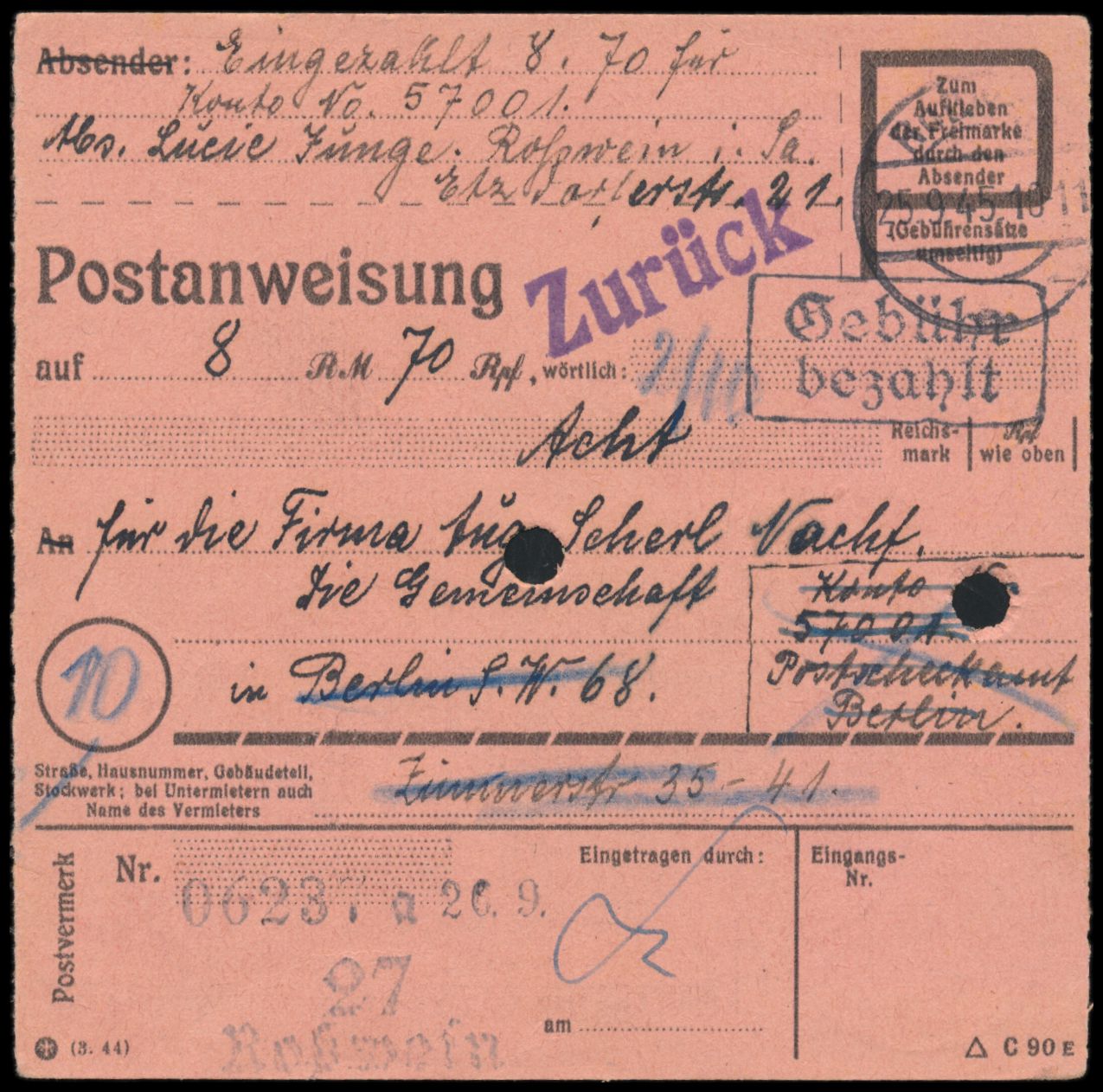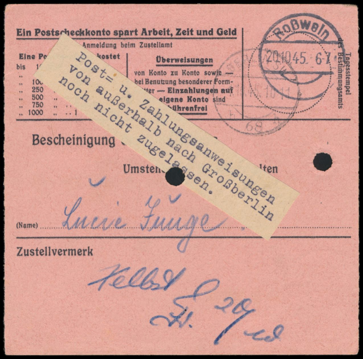 Postanweisung auf 8 RM mit Stempel Roßwein 25.9.45 und R2 Gebühr bezahlt nach Berlin SW 68, Ankunftstempel 1.10.45, L1 Zurück und rückseitig Aufkleber "Post- u. Zahlungsanweisungen von außerhalb nach Großberlin noch nicht zugelassen" , Ankunftstempel Roßwein 20.20.45, Betrag an Absender zurückgezahlt