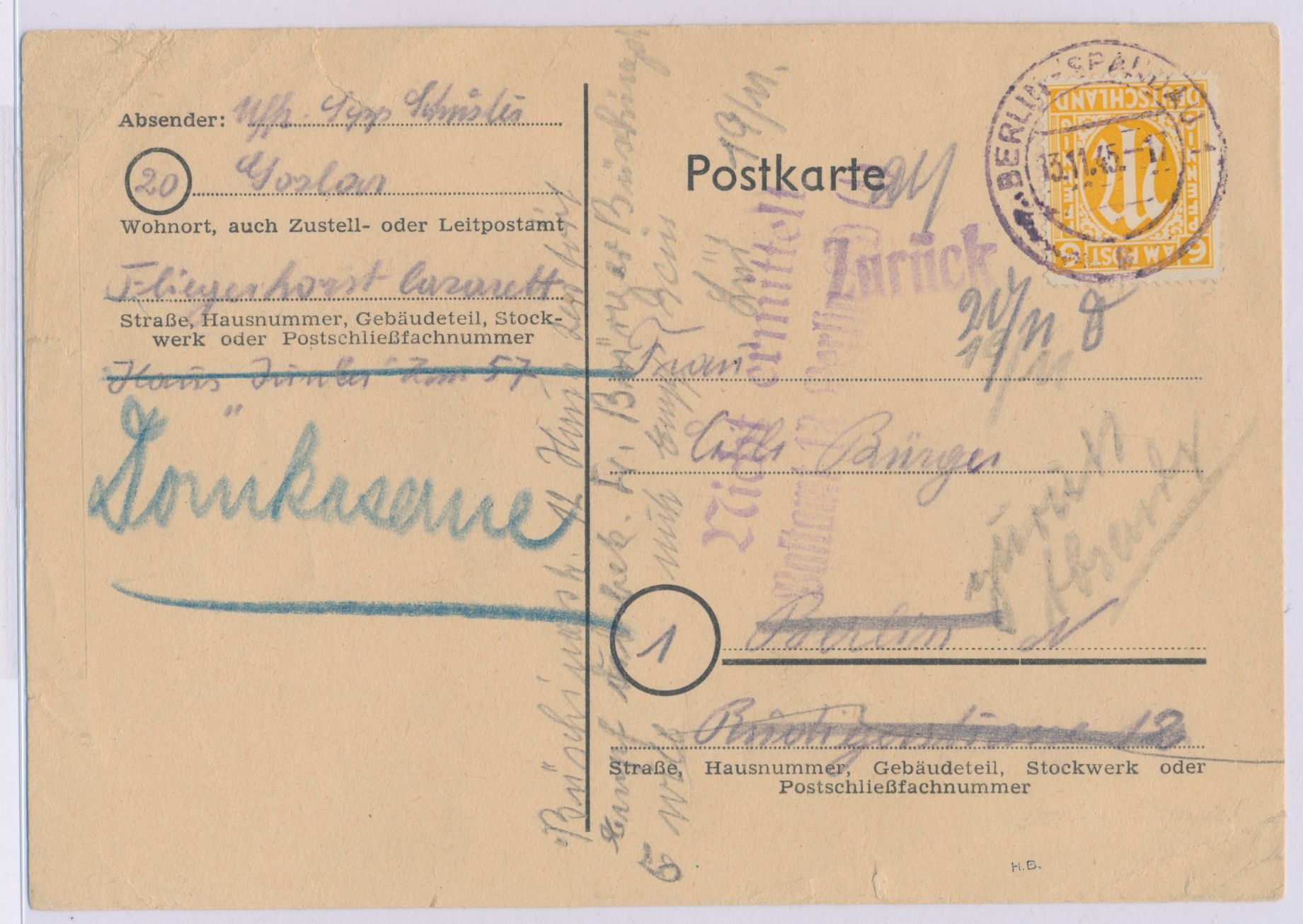 "Reisekarte" auf Goslar nach Berlin, Frankatur AM-Post 6 Pf. englischer Druck, aufgegeben in Berlin, Stempel Berlin-Spandau 1 13.11.45, in Berlin nicht ermittelt, entsprechende Stempel und handschriftliche Vermerke, zurück nach Goslar, Bedarf