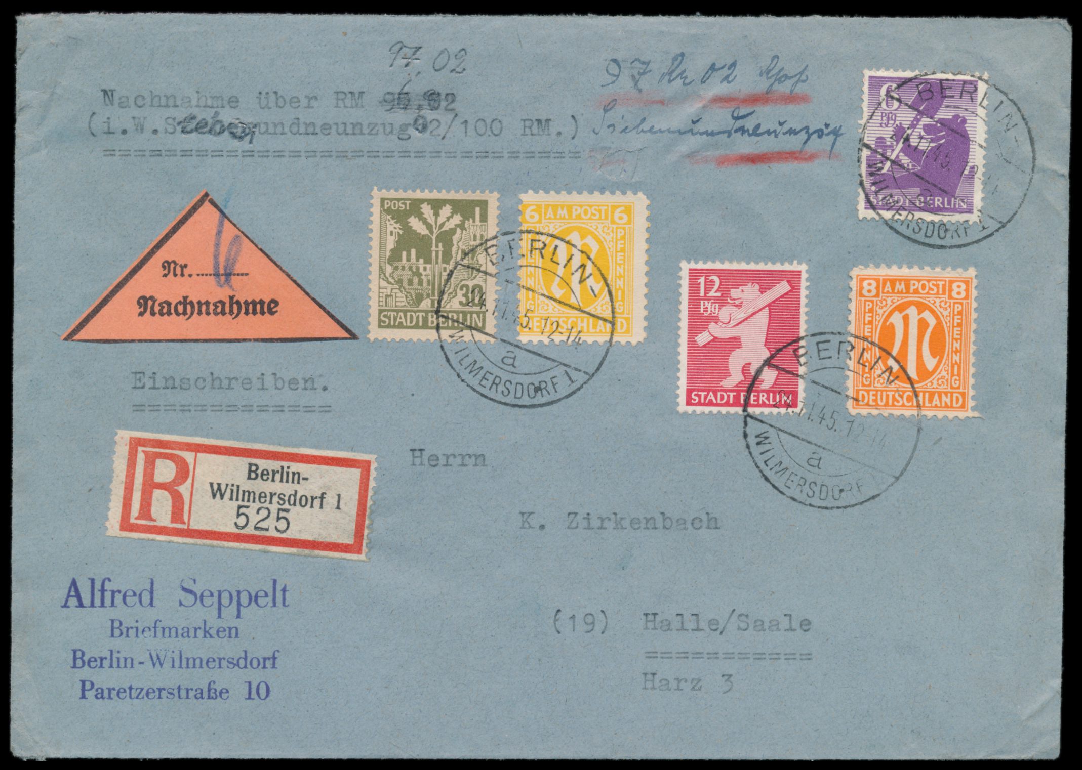Mischfrankatur 6, 12 und 30 Pf. Bär mit AM-Post 6 und 8 Pf. auf Einschreiben-Nachnahme-Brief nach Halle / Saale, Stempel Berlin-Wilmersdorf 1 24.11.45, Ankunftstempel 27.11.45, portorichtige 62 Pf.-Frankatur