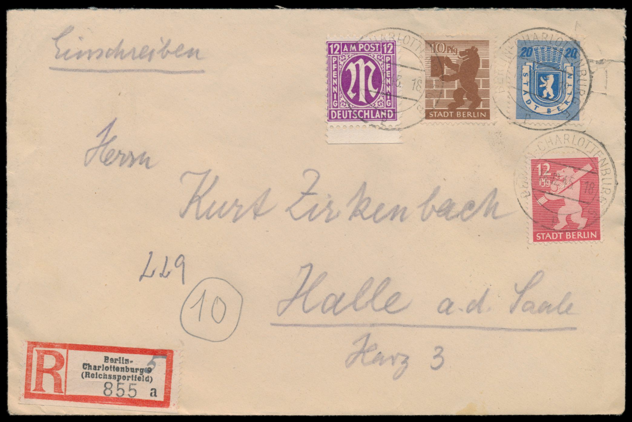 Mischfrankatur 10, 12 und 20 Pf. Bär mit AM-Post 12 Pf. auf Einschreibbrief nach Halle / Saale, Stempel Berlin-Charlottenburg 5 14.12.45, Aushilfs-R-Zettel Berlin-Charlottenburg 9 (Reichssportfeld), Ankunftstempel 17.12.45, portorichtig