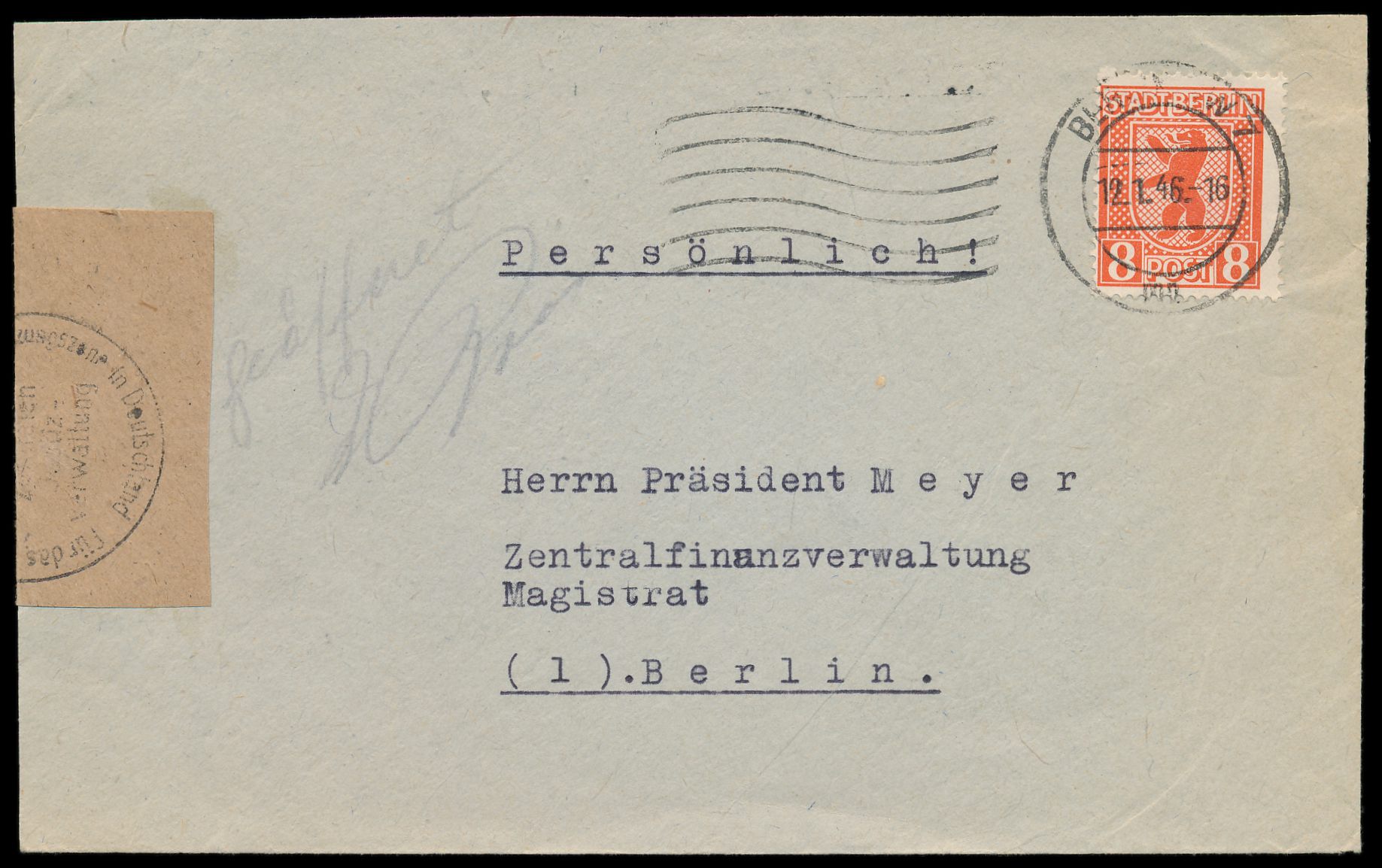 8 Pf. Bär auf Ortsbrief mit Maschinenstempel Berlin NW 7 12.1.46 an den Präsidenten der Zentralfinanzverwaltung des Magistrats, links handschriftlich "geöffnet ..." und brauner Verschlußzettel mit Dienststempel Kanzlei der Deutschen Zentralen Justiz-Verwaltung, Zensur ?