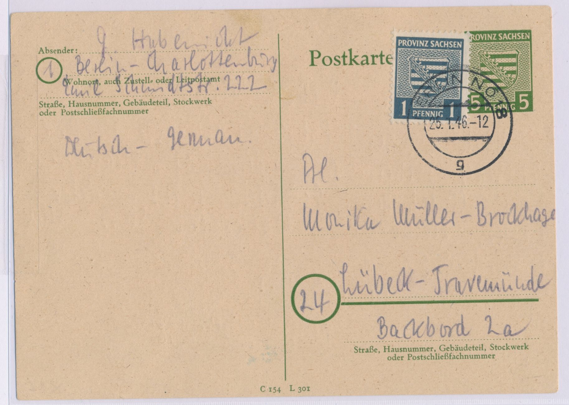 Provinz Sachsen-Ganzsache 5 Pf. mit Zusatzfrankatur 1 Pf. als seltene Verwendung in Berlin, Stempel Berlin NO 18 25.1.46, nach Lübeck-Travemünde, Bedarf