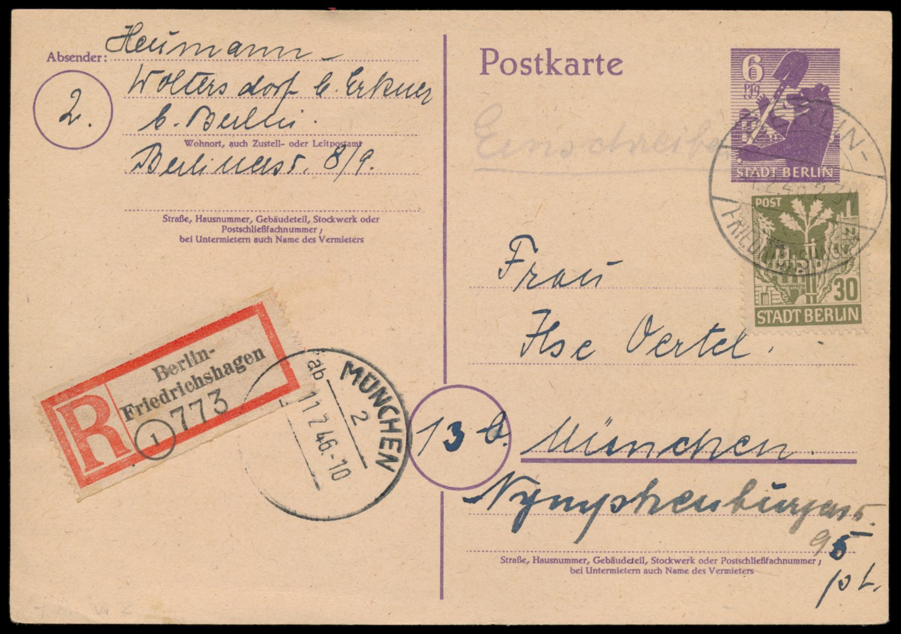 Ganzsache 6 Pf. mit Zusatzfrankatur 30 Pf. als Einschreiben nach München, Stempel Berlin-Friedrichshagen 1.2.46, Ankunftstempel 11.2.46, portorichtig, Bedarf