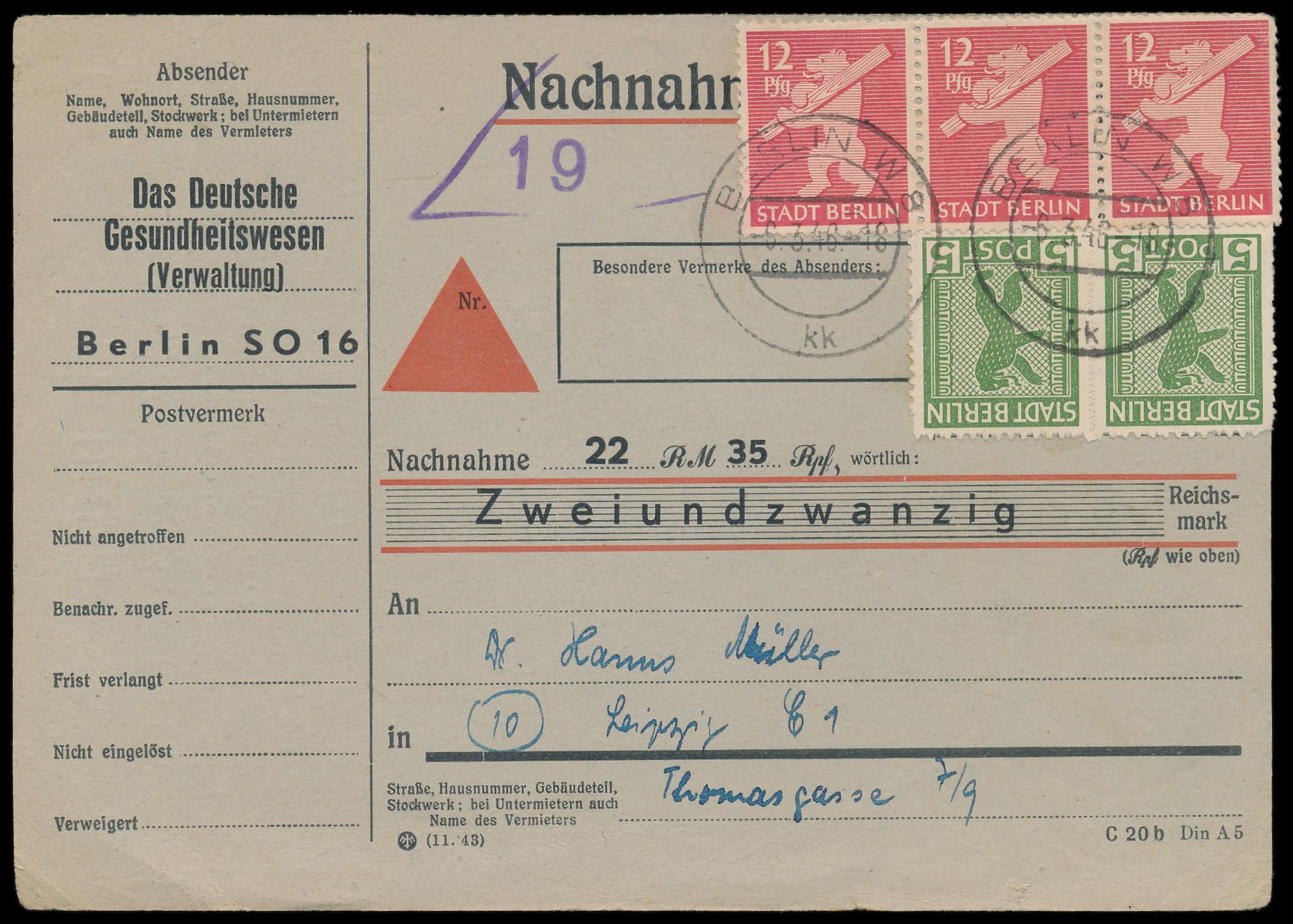 2 x 5 Pf. und 3 x 12 Pf. (eine Marke Zähnung durch Randklebung bestoßen) auf Vordruckkarte für eine Nachnahme-Drucksache mit Stempel Berlin W 8 6.3.46 nach Leipzig, portorichtig, seltene 46 Pf.-Portostufe, im Michel ohne Bewertung