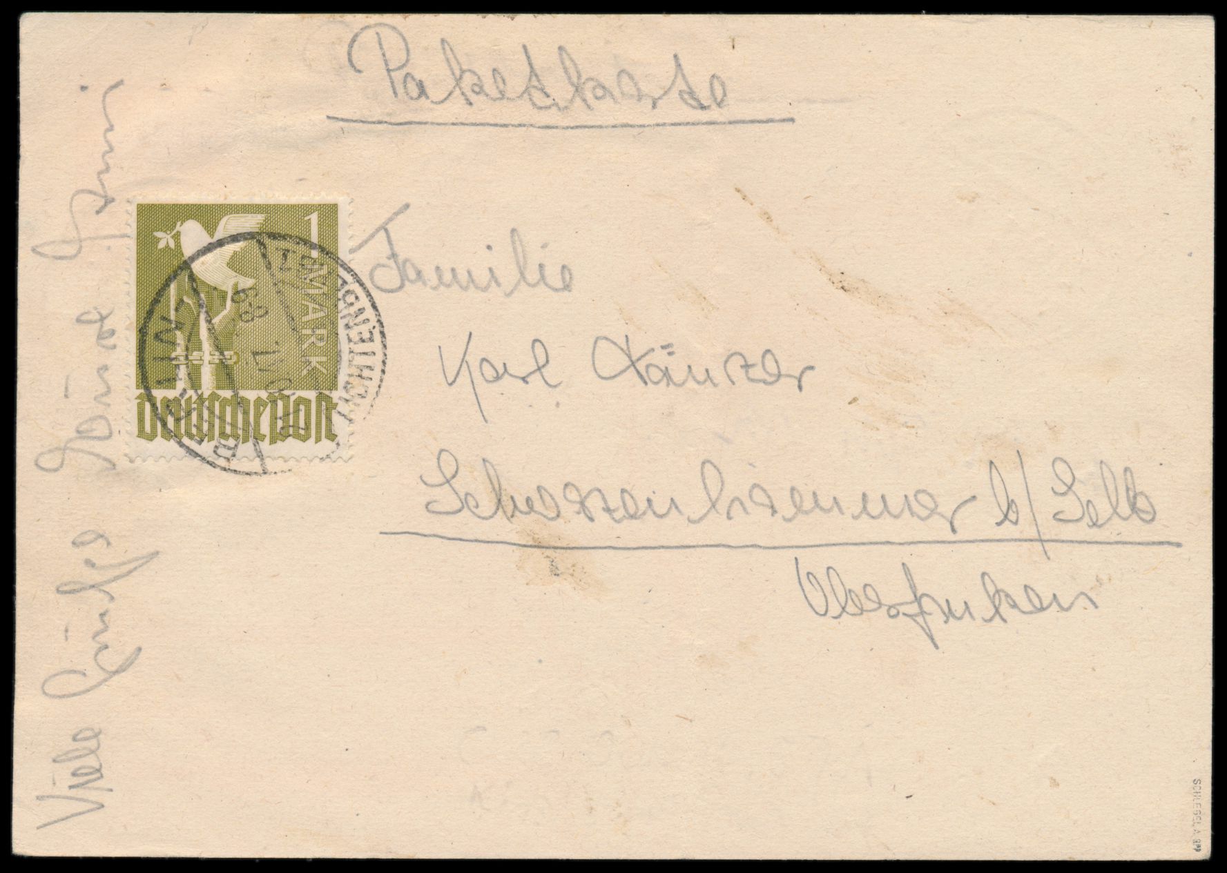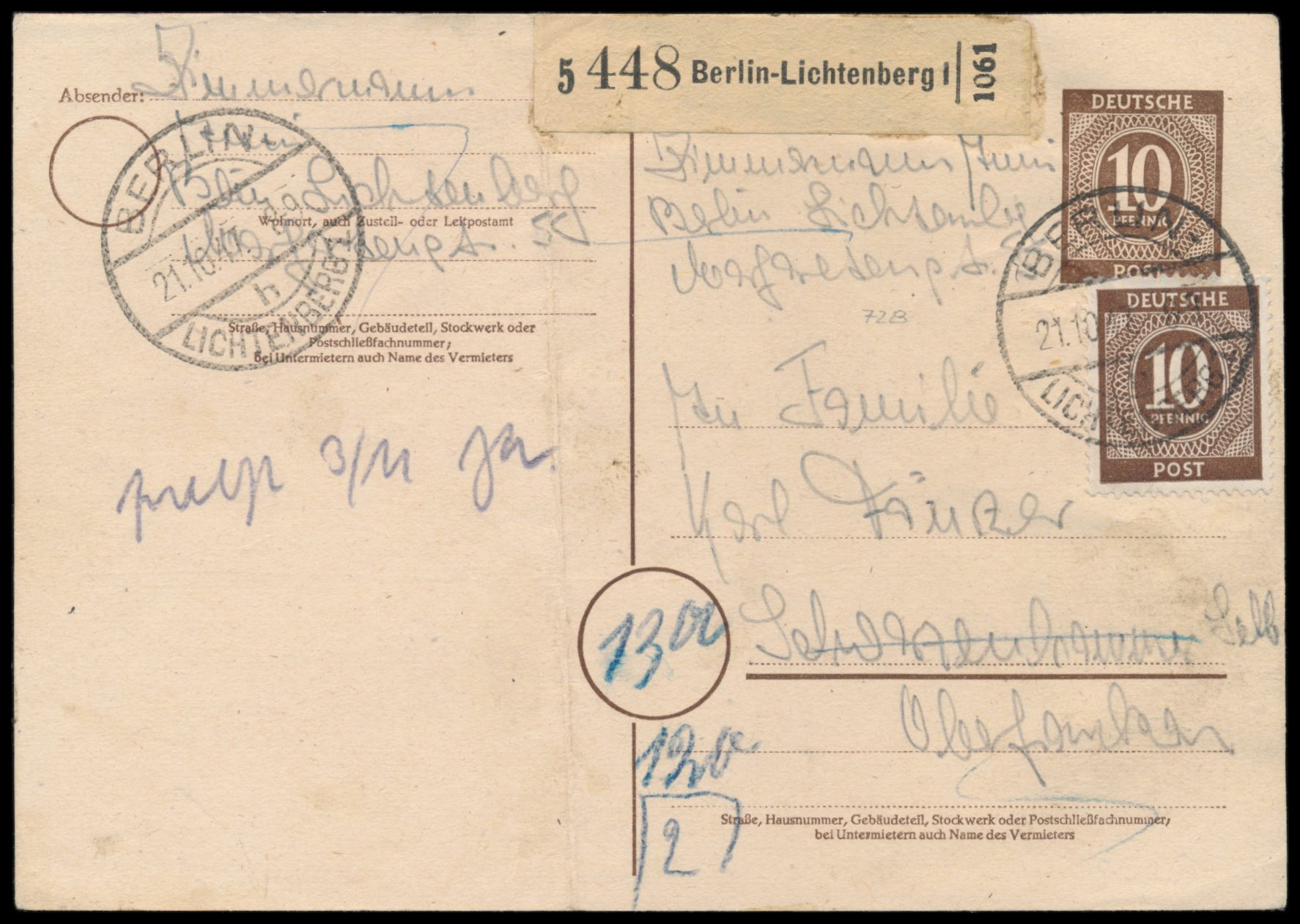 Ganzsache 10 Pf. Ziffer mit Zusatzfrankatur 10 Pf. Ziffer und 1 M. Taube (diese rückseitig) als Notpaketkarte mit Stempel Berlin-Lichtenberg 1 21.10.47, für ein Paket nach Schwarzenhammer bei Selb, Gewicht 2 Kg, Porto 120 Pf., Zustellvermerk 3.11., komplette Karte, übliche leichte Beförderungsspuren (senkrechter Bug)