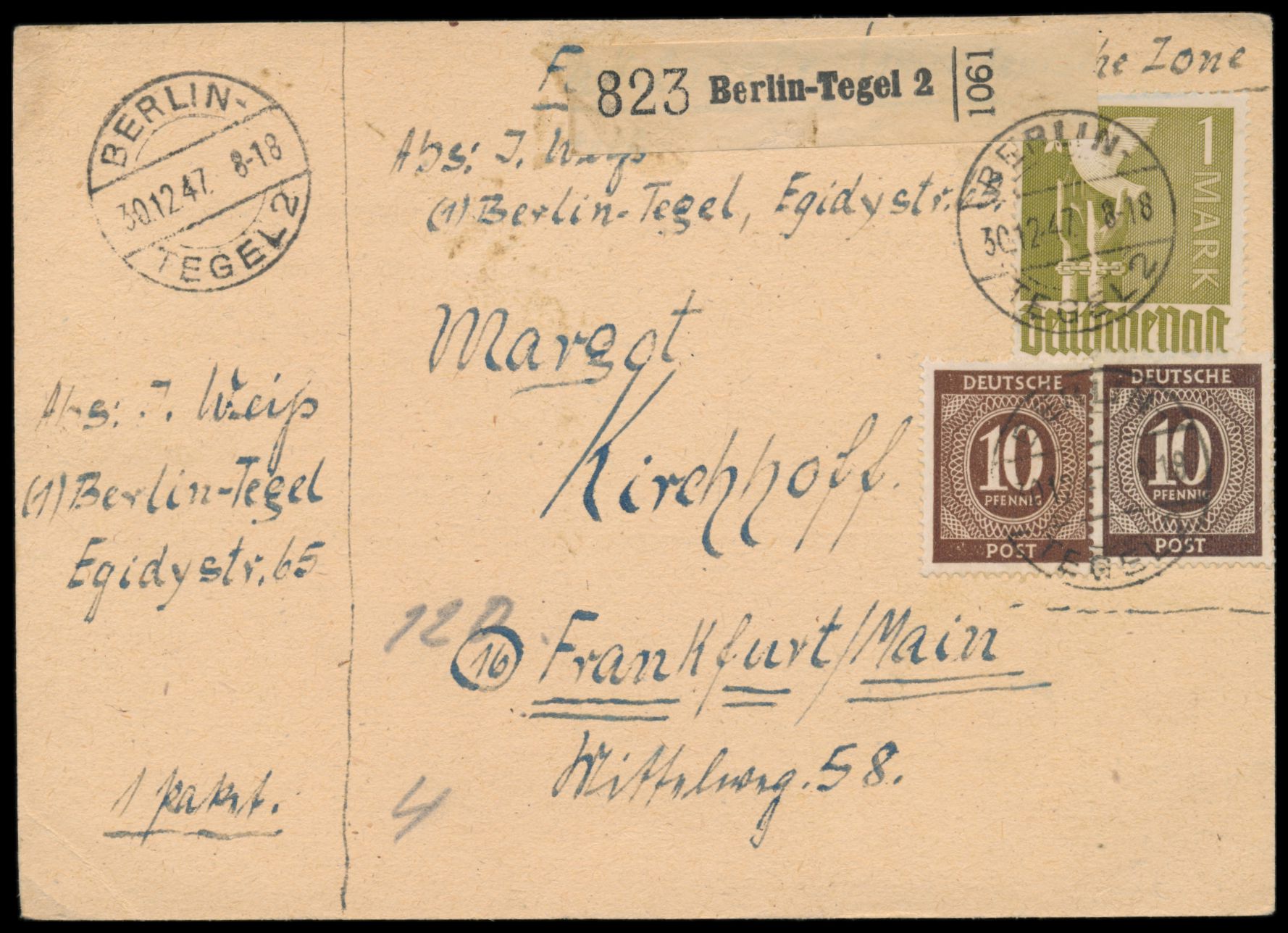 2 x 10 Pf. Ziffer und 1 M. Taube auf Firmenkarte der Volksfürsorge als Notpaketkarte, Stempel Berlin-Tegel 2 30.12.47, für ein Paket nach Frankfurt / Main, Gewicht 4 Kg., Porto 120 Pf.