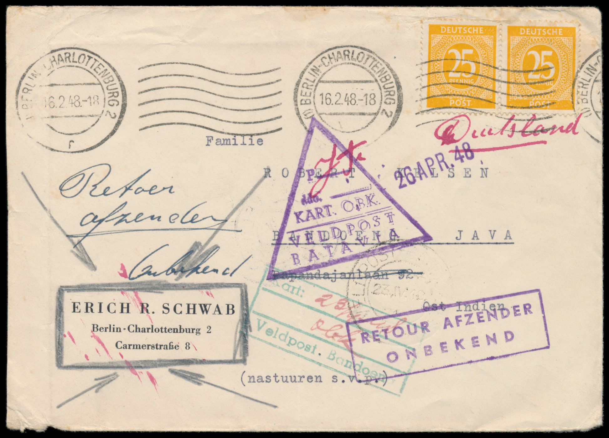 Auslandsbrief mit 2 x 25 Pf. Ziffer gelb nach Bandoeng auf Java, Maschinenstempel Berlin-Charlottenburg 2 16.2.48, rückseitig Zensur-Durchlaufstempel "30" der britischen Zensurstelle in Berlin, Ankunftstempel Veldpost-Batavia 22.4.48, Suchstempel Veldpost Bandoeng und Veldpost Batavia, zurück "unbekannt", seltener Beleg des indonesischen Unabhängigkeitskrieges, Bedarf