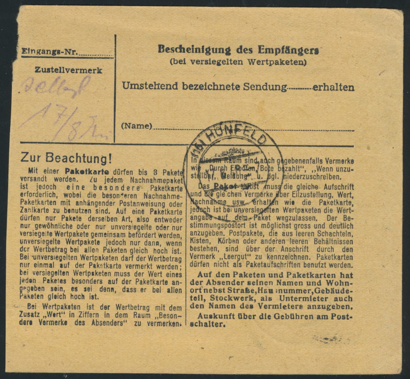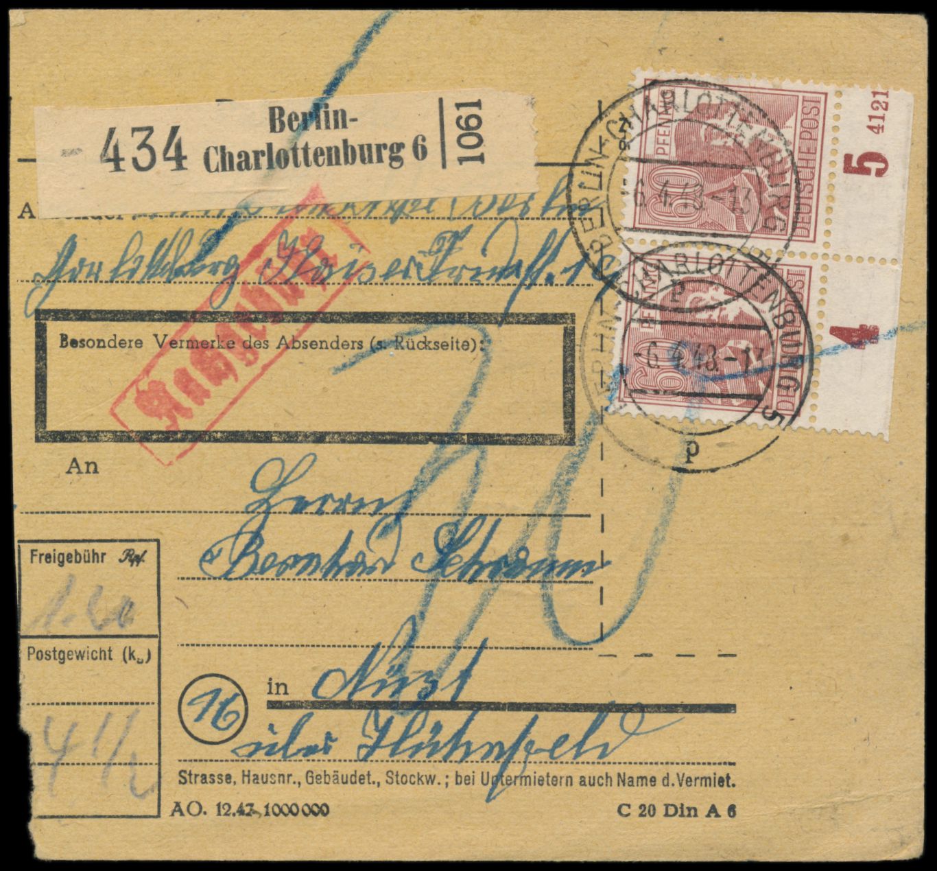 2 x 60 Pf. Arbeiter auf Paketkarte aus West-Berlin mit Stempel Berlin-Charlottenburg 6 6.4.48 nach Nüst bei Hünfeld, Ankunftstempel Hünfeld 17.6.48, handschriftlich 30 Pf. Zustellgebühr in blau. Nachdem die Sowjetunion Ende März die Mitarbeit im Alliierten Kontrollrat eingestellt hatte, kam es bereits im April 1948 zu Behinderungen im Waren- und Paketverkehr zwischen den Westzonen und Berlin