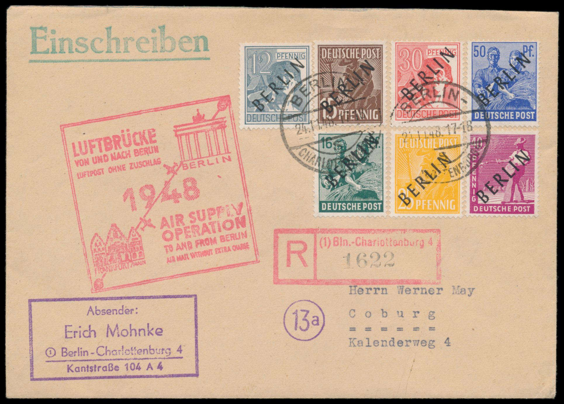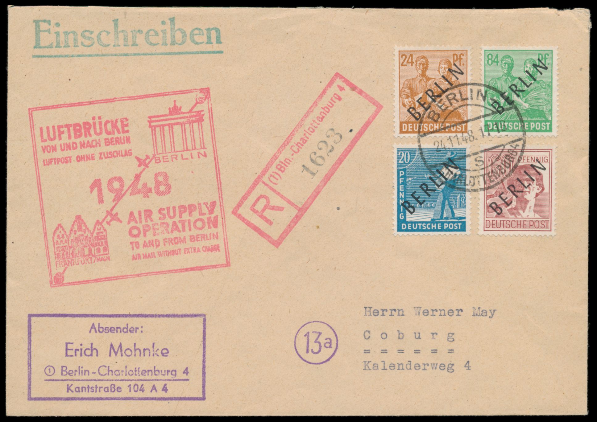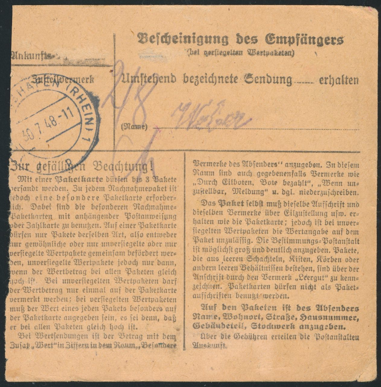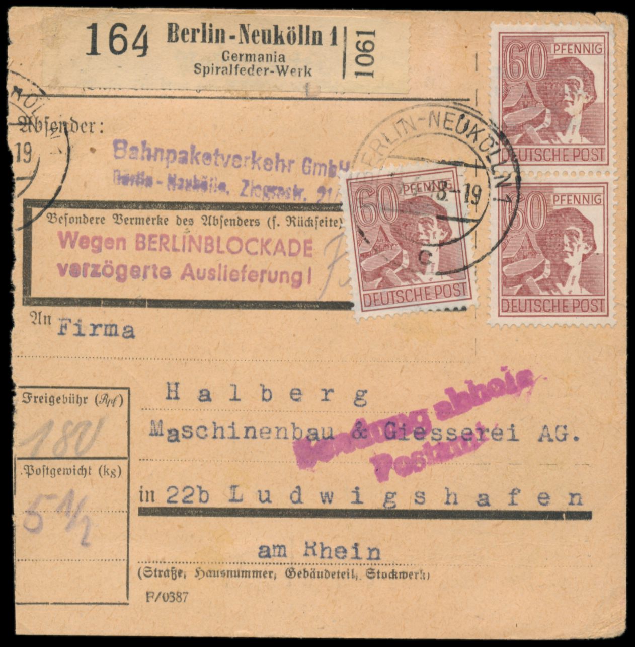 3 x 60 Pf. Arbeiter auf Selbstbucher-Paketkarte aus West-Berlin mit Stempel Berlin-Neukölln 1 14.4.48 nach Ludwigshafen, aufgeliefert durch die "Bahnpaketverkehr GmbH, Berlin-Neukölln", seltener Hinweisstempel "Wegen Berlinblockade verzögerte Auslieferung" , Ankunftstempel Ludwigshafen (Rhein) 1 30.7.48, möglicherweise über die Luftbrücke ausgeflogen. Nachdem die Sowjetunion Ende März die Mitarbeit im Alliierten Kontrollrat eingestellt hatte, kam es bereits im April 1948 zu Behinderungen im Waren- und Paketverkehr zwischen den Westzonen und Berlin