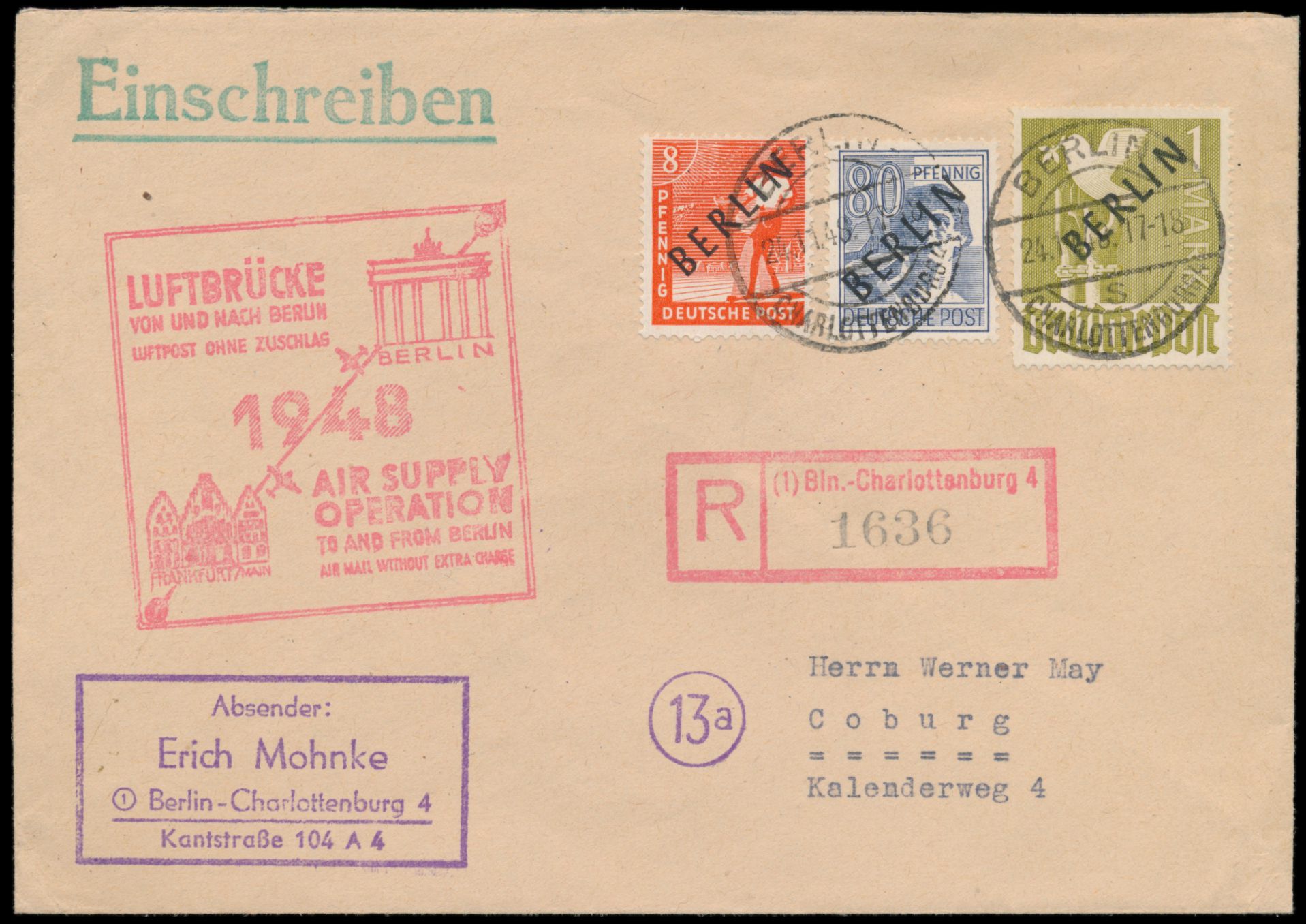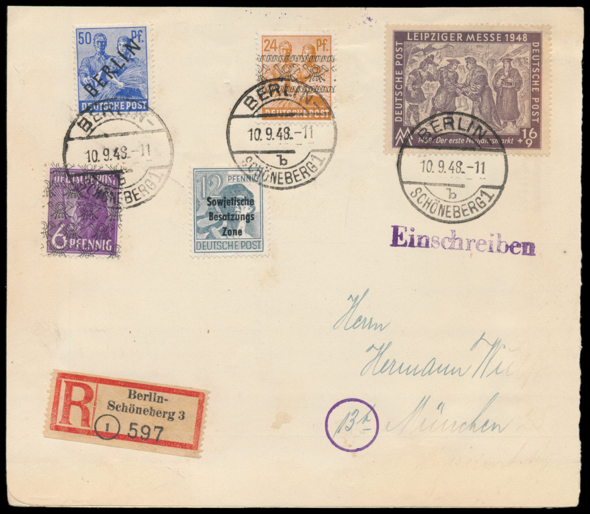 Leipziger Herbstmesse 1948 16 Pf. als seltene West-Berlin-Verwendung in Mischfrankatur mit SBZ-Maschinenaufdruck, Bizone 6 und 24 Pf. und Berlin-Schwarzaufdruck 50 Pf. auf portorichtigem Einschreibbrief 2. Gewicht, Stempel Berlin-Schöneberg 1 10.9.48, nach München, Ankunftstempel 13.9.48