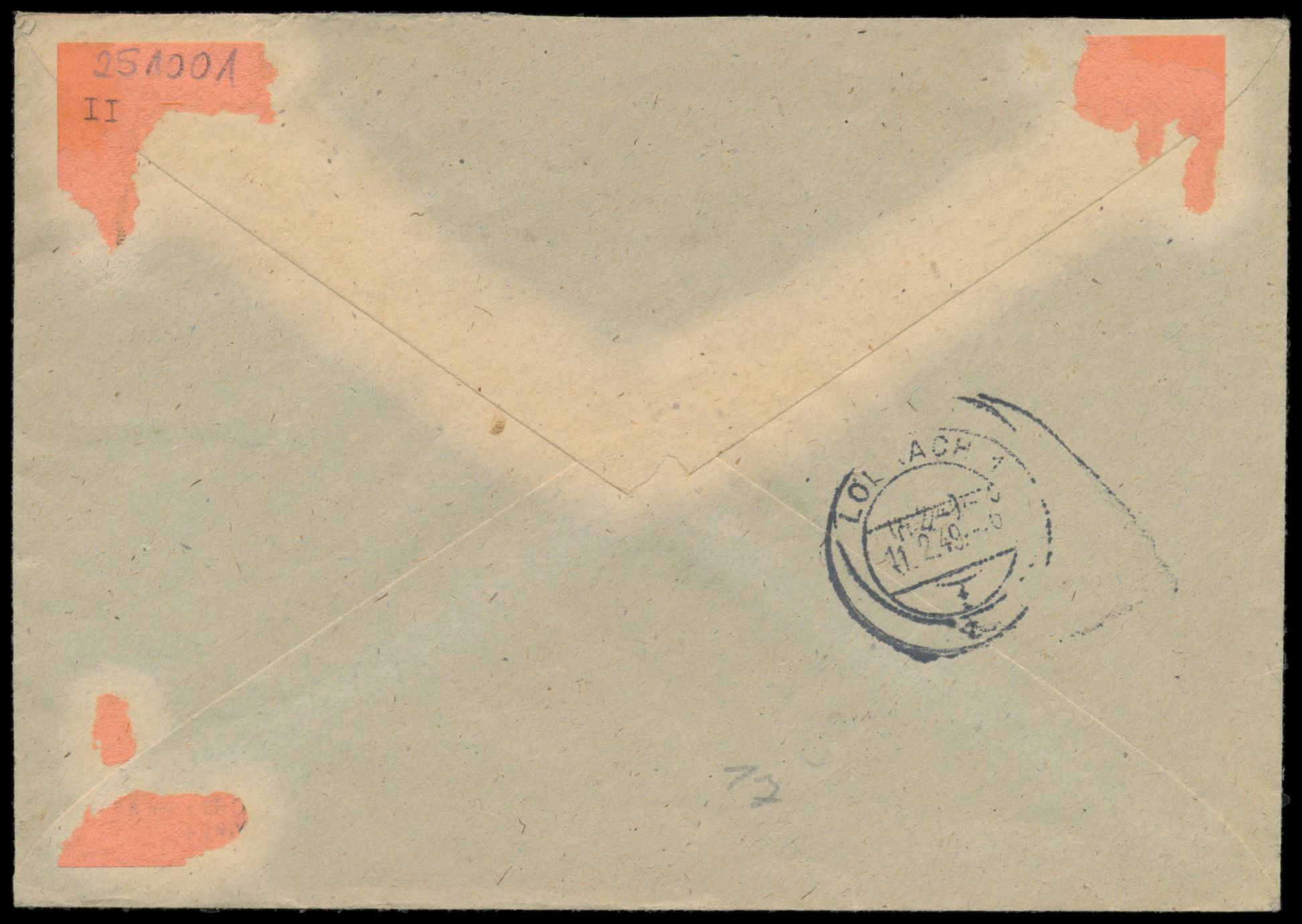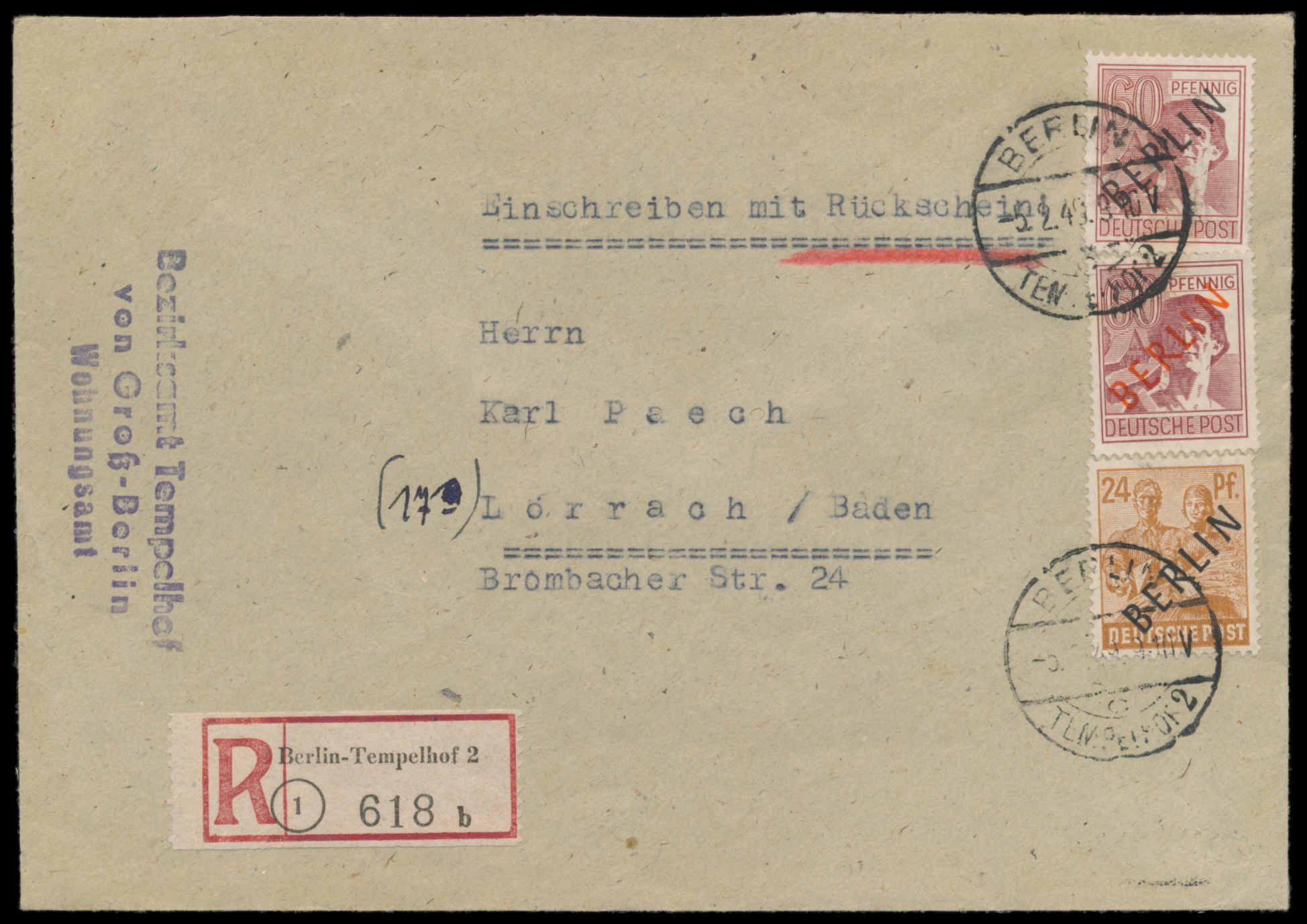 Mischfrankatur Schwarzaufdruck 24 Pf. und 60 Pf. und Rotaufdruck 60 Pf. auf Einschreiben-Rückschein-Brief, Stempel Berlin-Tempelhof 2 5.2.49, nach Lörrach, Ankunftstempel 11.2.49, sehr seltene Währungsmischfrankatur, bei der die Rückschein-Gebühr mit Ostmark bezahlt wurde, portorichtig, rückseitig Briefklappe mit Leimdurchschlag, vorderseitig sehr schön, Bedarf, Absender ist das Bezirksamt Tempelhof
