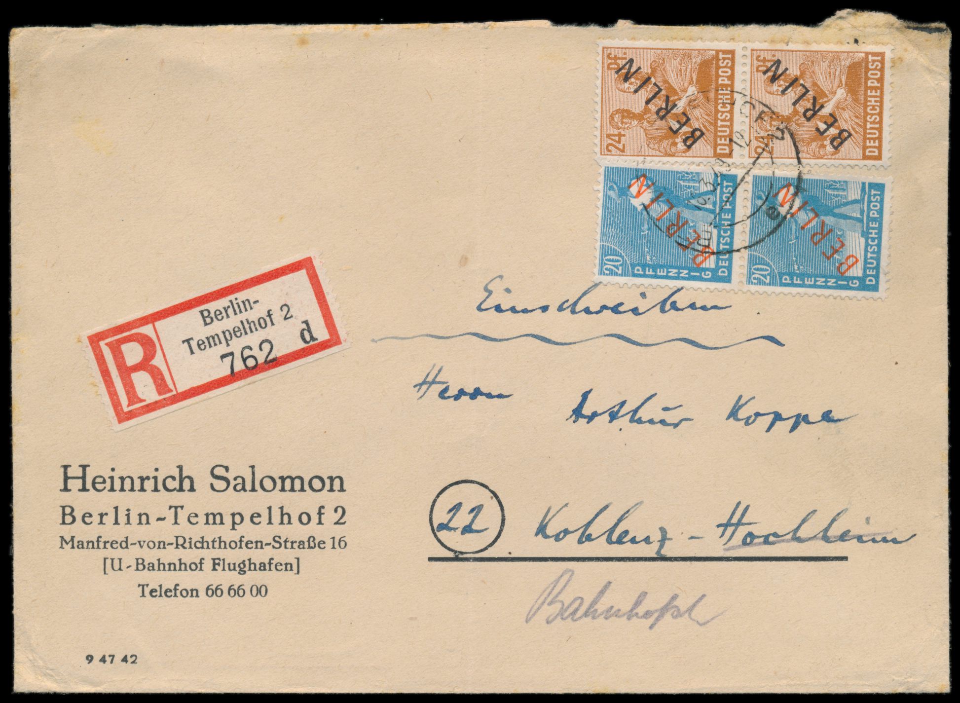 2 x 24 Schwarzaufdruck mit 2 x 20 Pf. Rotaufdruck als Währungsmischfrankatur auf Einschreibbrief 2. Gewicht, Stempel Berlin-Tempelhof 2 16.3.49, nach Koblenz, Ankunftstempel 19.3.49, portorichtig, seltene Portostufe, schwacher senkrechter Mittelbug, Bedarf
