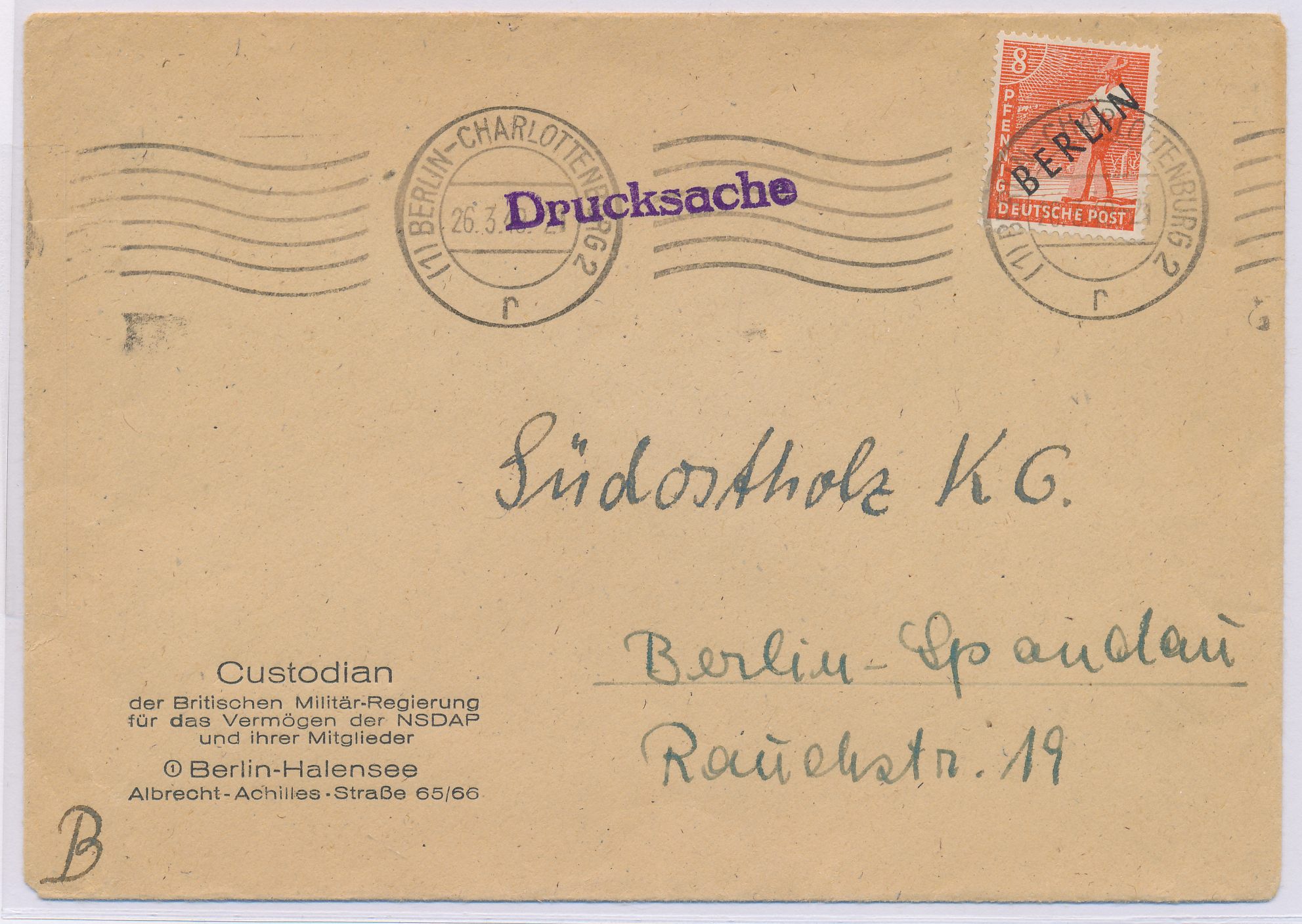 Einzelfrankatur 8 Pf. Schwarzaufdruck auf Orts-Drucksache 2. Gewicht, Maschinenstempel Berlin-Charlottenburg 2 26.3.49, vorderseitig Absendereindruck "Custodian der Britischen Militärregierung für das Vermögen der NSDAP ..."