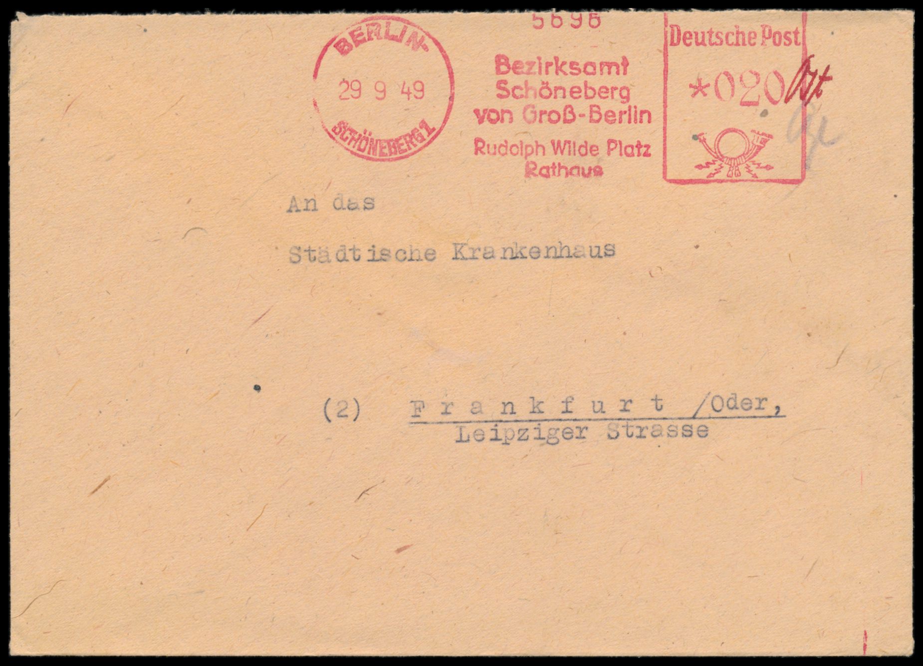 Absenderfreistempel "Bezirksamt Schöneberg von Groß-Berlin", Berlin-Schöneberg 1 29.9.49, Wertangabe 020 Pf. mit handschriftlichem Zusatz "Ost" und Paraphe eines Postbeamten, Brief nach Frankfurt / Oder