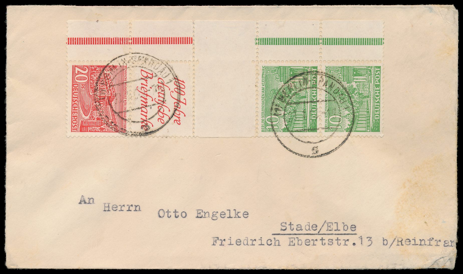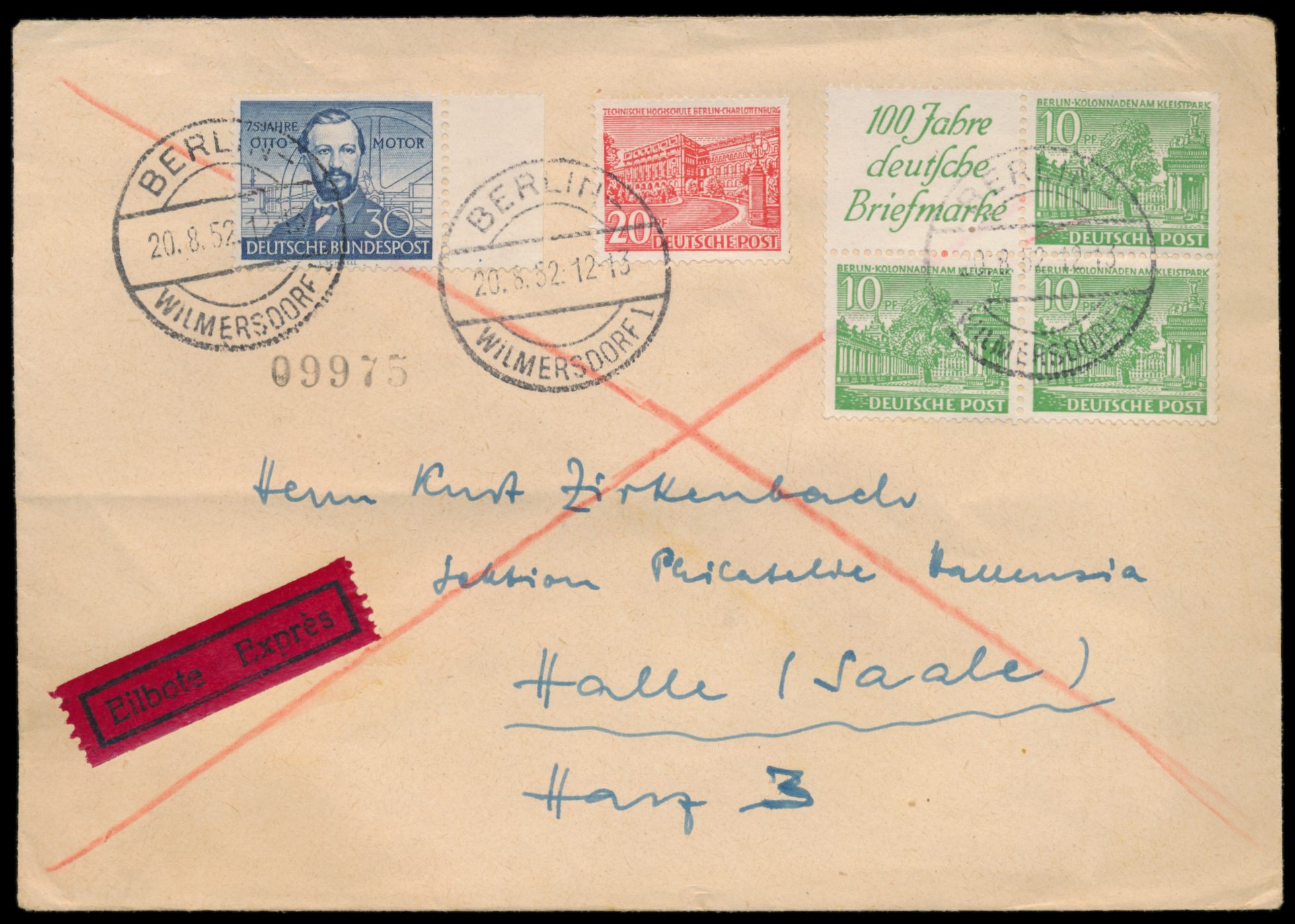 Zusammendruck 10 Pf. mit Reklamefeld "100 Jahre deutsche Briefmarke" im Viererblock und 20 Pf. Bauten und BRD 30 Pf. "Otto-Motor" als Eilbotenbrief, Stempel Berlin-Wilmersdorf 1 20.8.52, nach Halle / Saale, Ankunftstempel 21.8.52, portorichtig