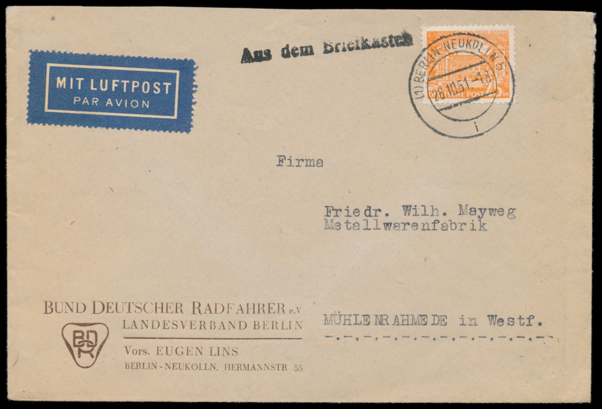 Einzelfrankatur 25 Pf. Bauten auf Luftpostbrief mit Stempel Berlin-Neukölln 5 28.11.51 und L1 Aus dem Briefkasten nach Westdeutschland, Bedarf