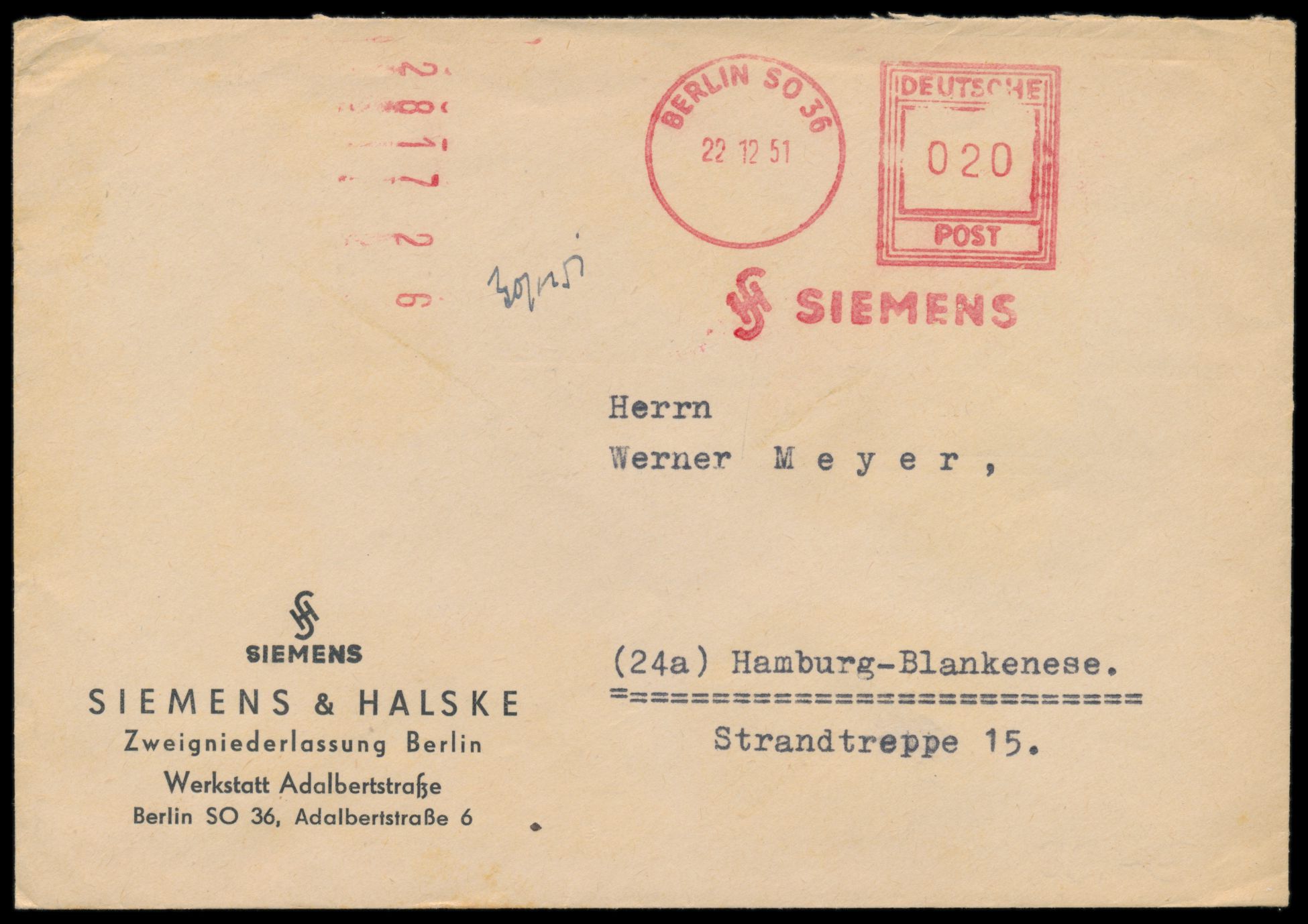 Komusina-Absenderfreistempel "Siemens" mit neuem Wertrahmen "Deutsche Post" im kleinen Format und Wertziffer 020, Berlin SO 36 22.12.51, Brief nach Hamburg, nur zwei Stempel diesen Typs im Einsatz und einzige Maschine in Berlin