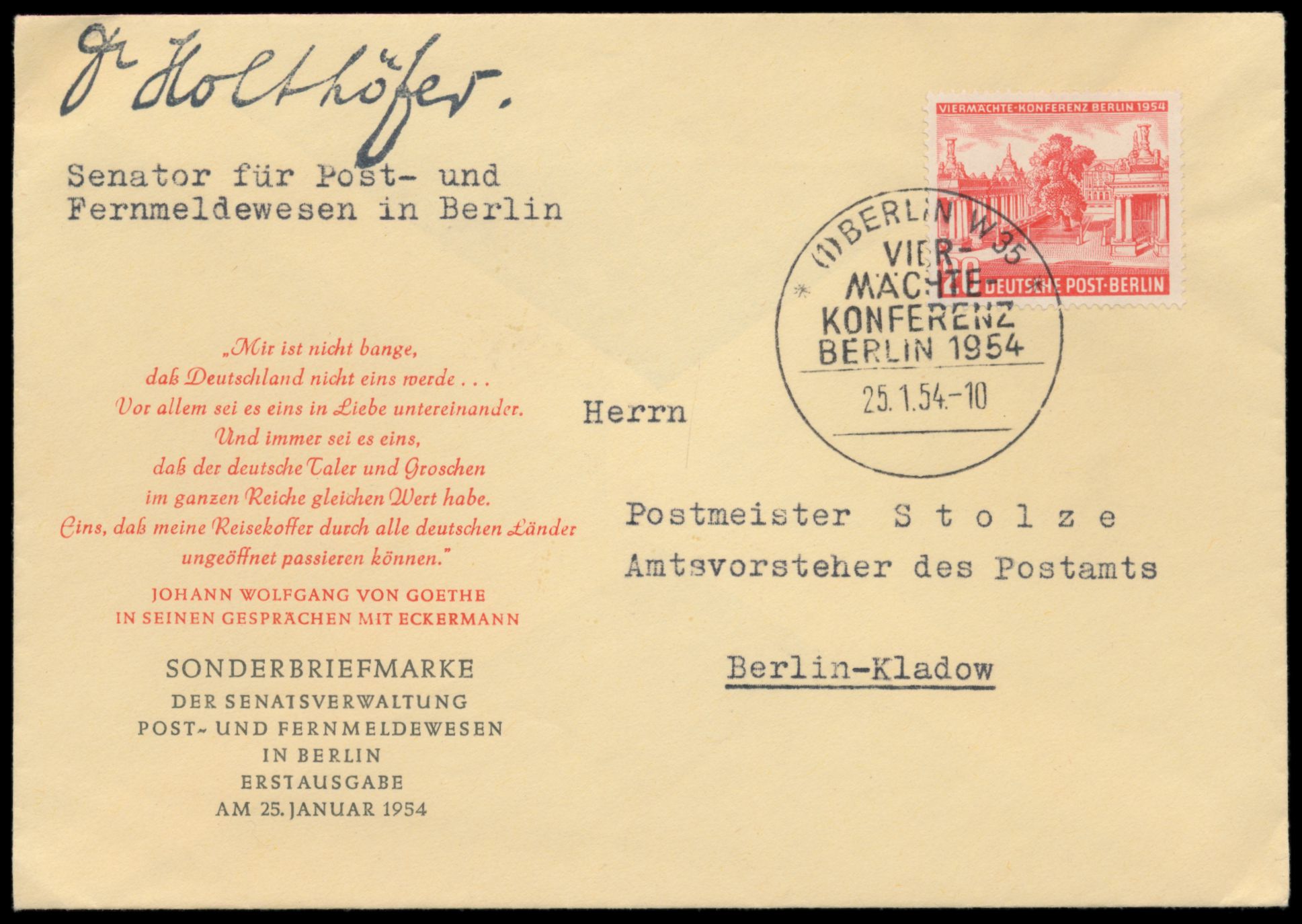 Viermächte-Konferenz 1954, amtlicher FDC mit Sonderstempel 25.1.54, vorderseitig links oben gestempelte Unterschrift "Dr. Holthöfer" und Schreibmaschinen-Zusatz "Senator für Post- und Fernmeldewesen in Berlin (Variante r), adressiert an Postmeister Stolze , Postamt Berlin-Kladow, mit Beilagekarte (Typ d) ohne Unterschriftenstempel