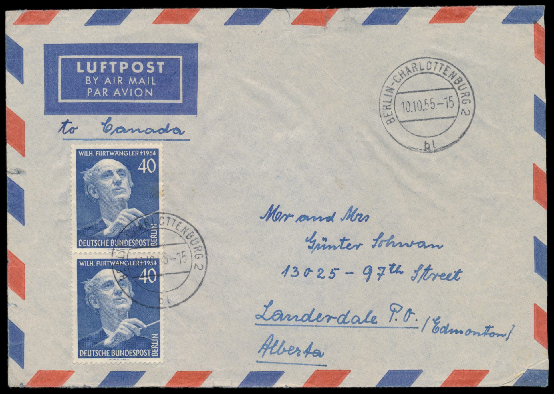 2 x 40 Pf. Furtwängler auf Luftpostbrief nach Canada, Stempel Berlin-Charlottenburg 2 10.10.55, Ankunftstempel Lauderdale-Edmonton 17.10.55, portorichtig (Zone 2, 6 bis 10 g), Bedarf