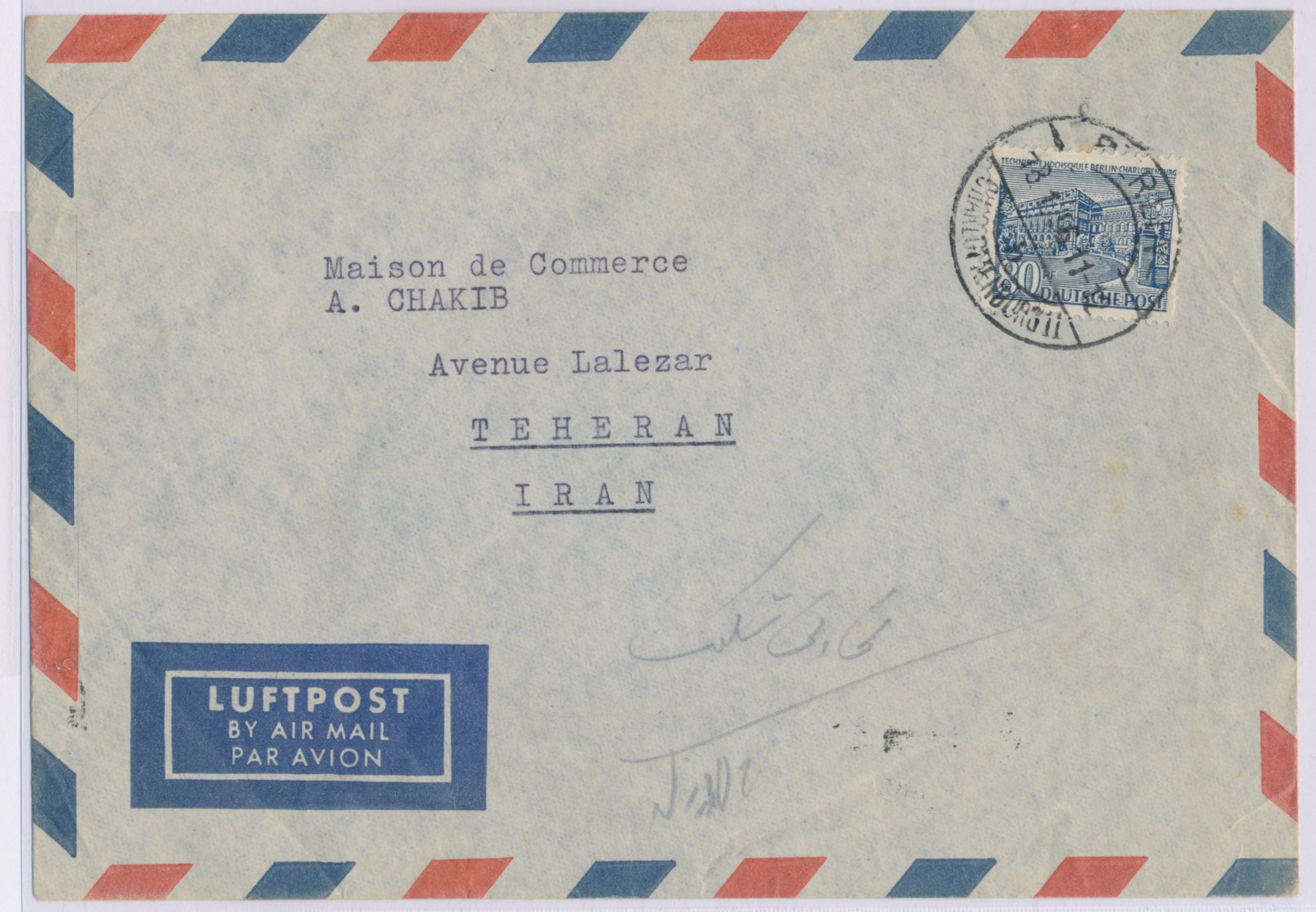 Einzelfrankatur 80 Pf. Bauten mit Stempel Berlin-Charlottenburg 11 18.1.56 auf Luftpostbrief nach Iran, Ankunftstempel Teheran 21.1.56, seltene Destination