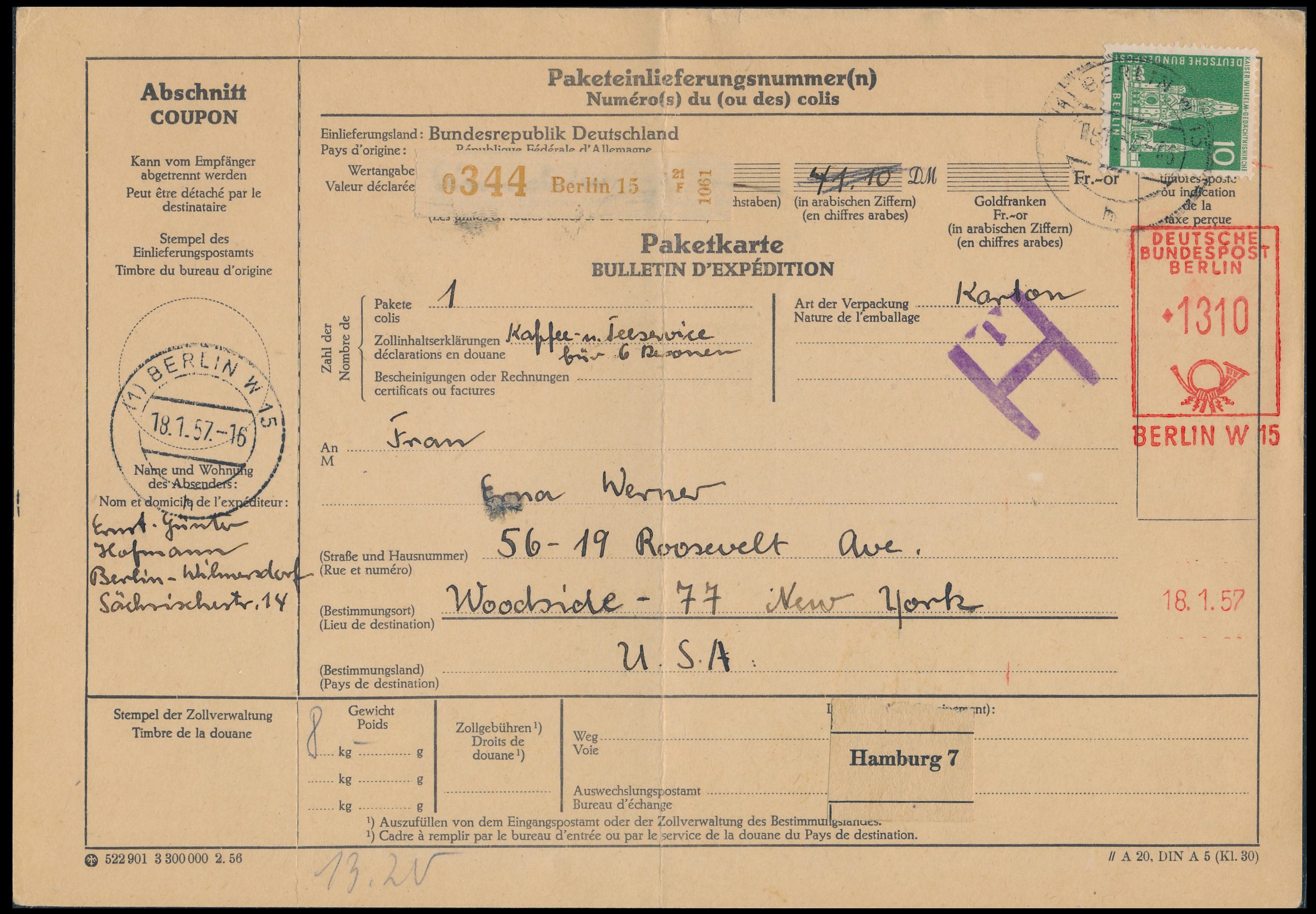 großformatige Auslandspaketkarte nach USA (senkrecht gefaltet), Mischfrankatur Paketkartenfreistempel Berlin W 15 mit Wertangabe 1310 Pf. 18.1.57 und Bauten III 10 Pf. , Stempel Berlin W 15 18.1.57