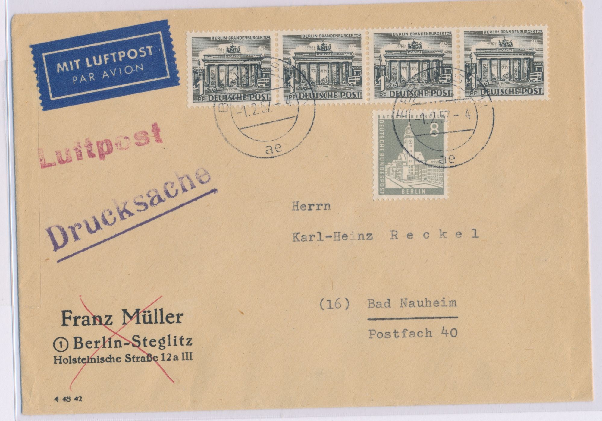 4 x 1 Pf. Bauten I und 8 Pf. Bauten II auf Luftpost-Drucksache mit Stempel Berlin SW 11 1.2.57 nach Bad Nauheim, portorichtig, Bedarf