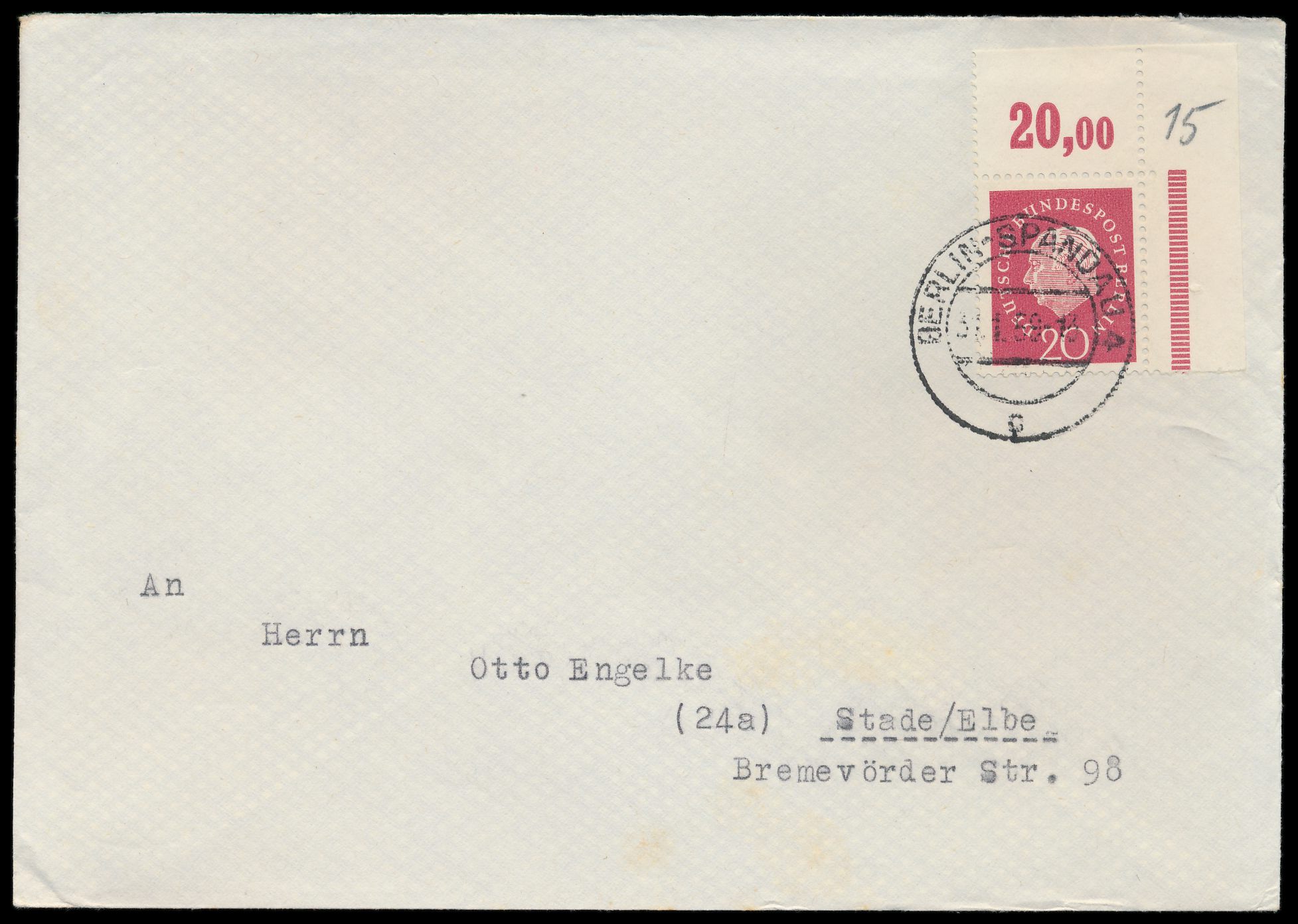 20 Pf. Heuss mit Plattendruck-Eckrand rechts oben auf Brief nach Stade, Stempel Berlin-Spandau 31.1.59, MiPr. 70 für lose Marke, Brief -.-