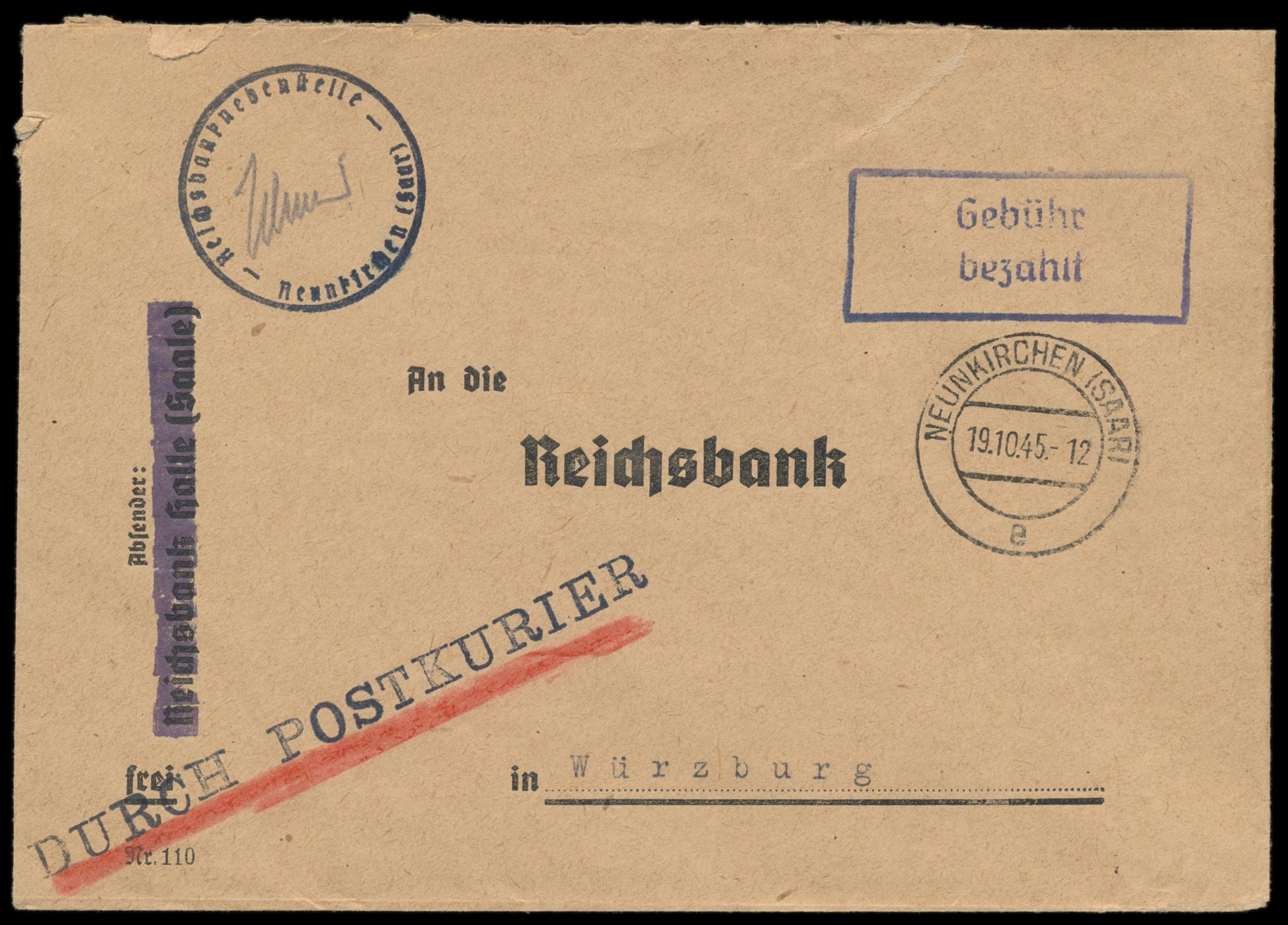 Reichsbank-Kurierbrief (Gebühr 1 RM) der Reichsbanknebenstelle Neunkirchen (Saar) nach Würzburg vor allgemeiner Zulassung des Interzonen-Postverkehrs, Setzkasten-Z1 "Durch Postkurier" , Stempel Neunkirchen (Saar) 19.10.45 und violetter R2 Gebühr bezahlt