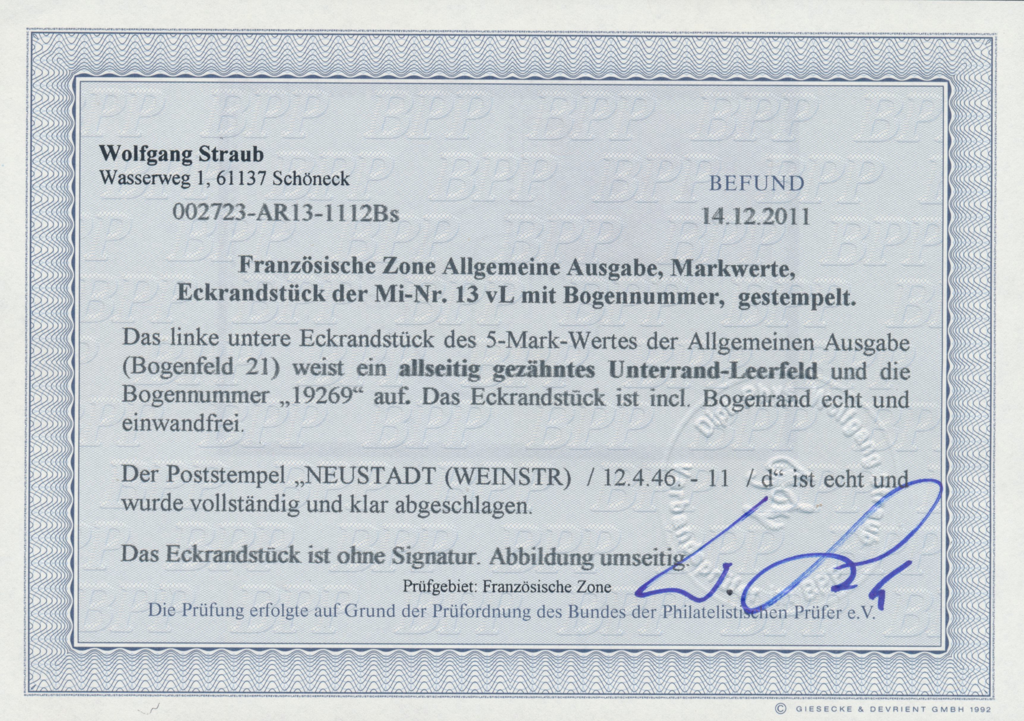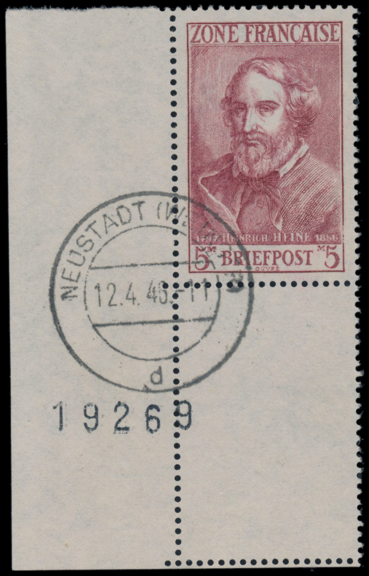 5 M Heinrich Heine als unteres linkes Eckrandstück mit Leerfeld und Bogennummer 19269, sauberer Stempel Neustadt (Weinstr) 12.4.46, Befund Straub BPP: echt und einwandfrei