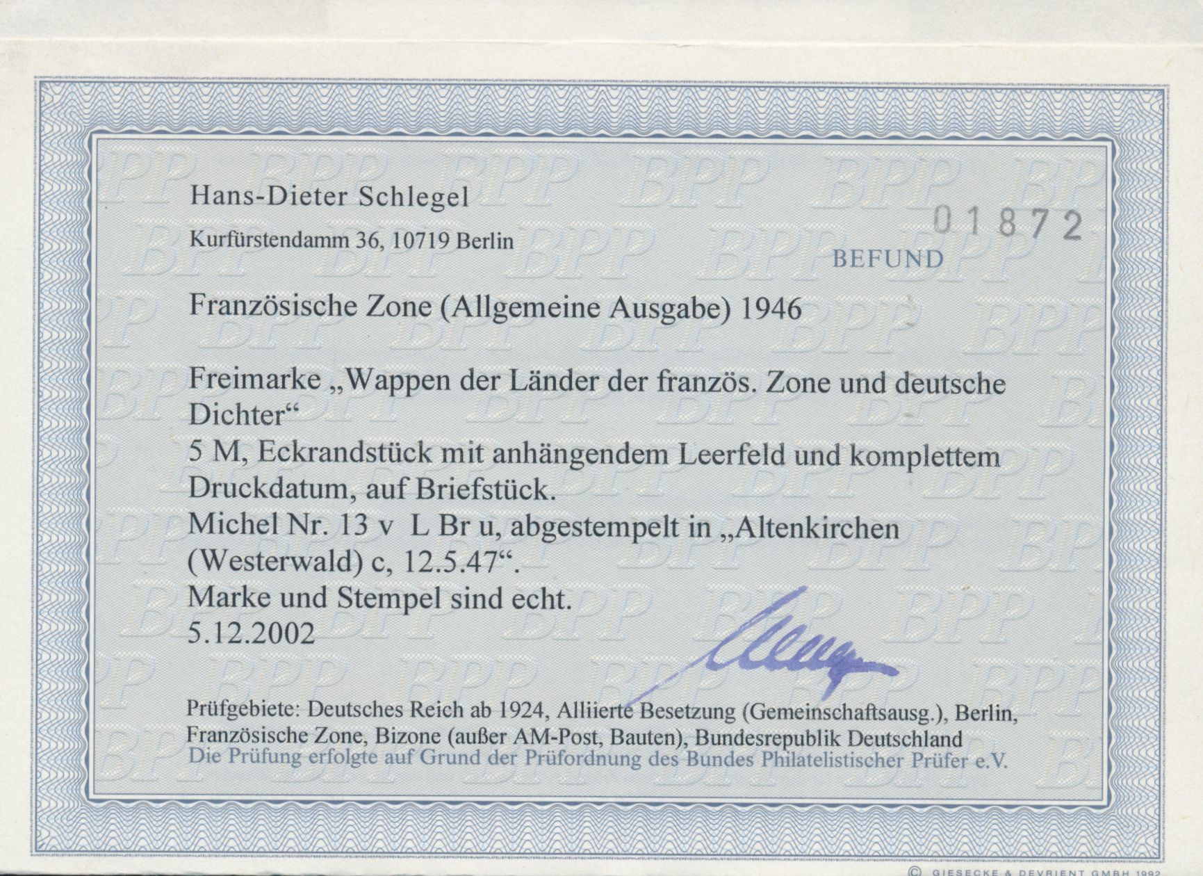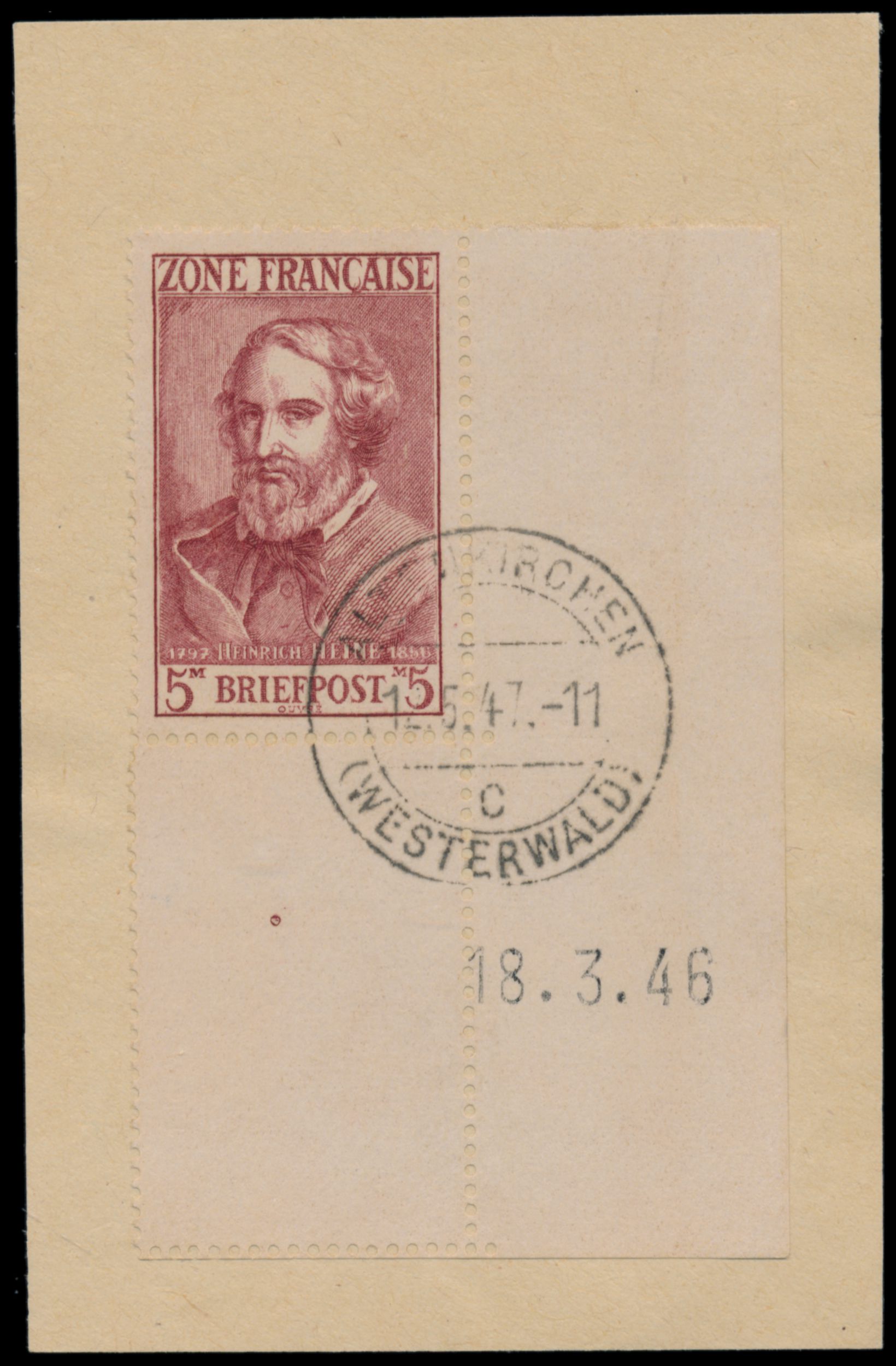 5 M Heinrich Heine als unteres rechtes Eckrandstück mit Leerfeld und Druckdatum 18.3.46, sauberer Stempel Altenkirchen (Westerwald) 12.5.47, Befund Hans-Dieter Schlegel BPP: echt und einwandfrei