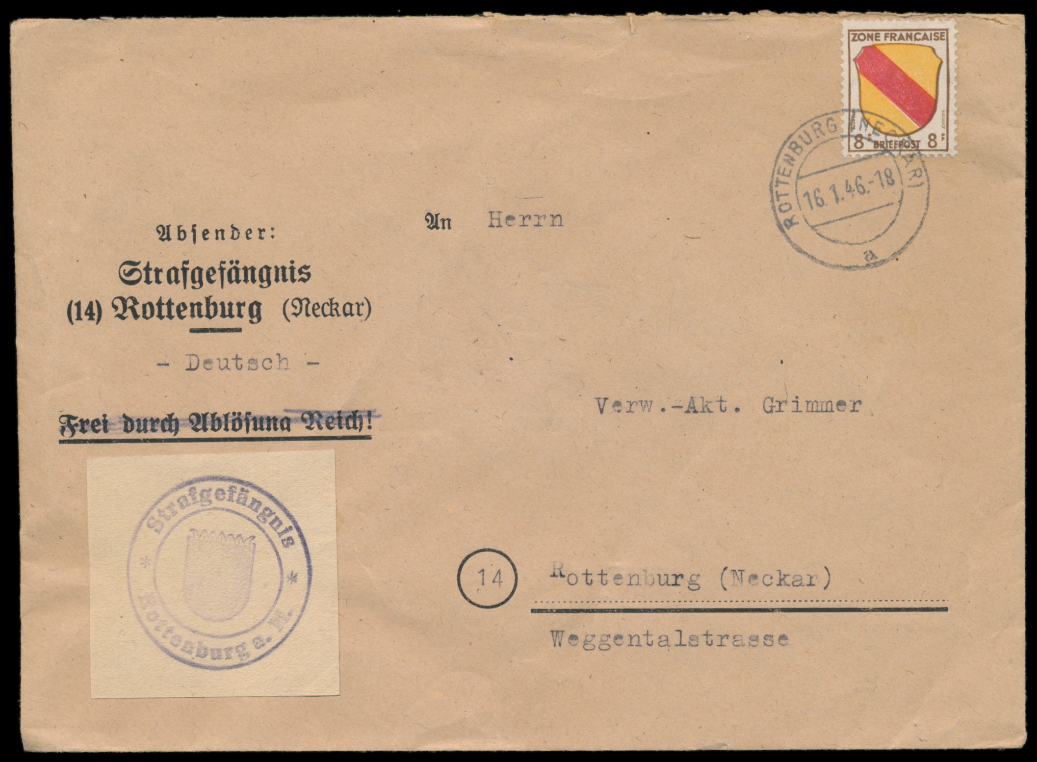 Einzelfrankatur 8 Pf. auf Ortsbrief mit Stempel Rottenburg (Neckar) 16.1.46, Absender Strafgefängnis Rottenburg (Neckar), frühes Verwendungsdatum der Marke (Ersttag 11.1.1946), Bedarf