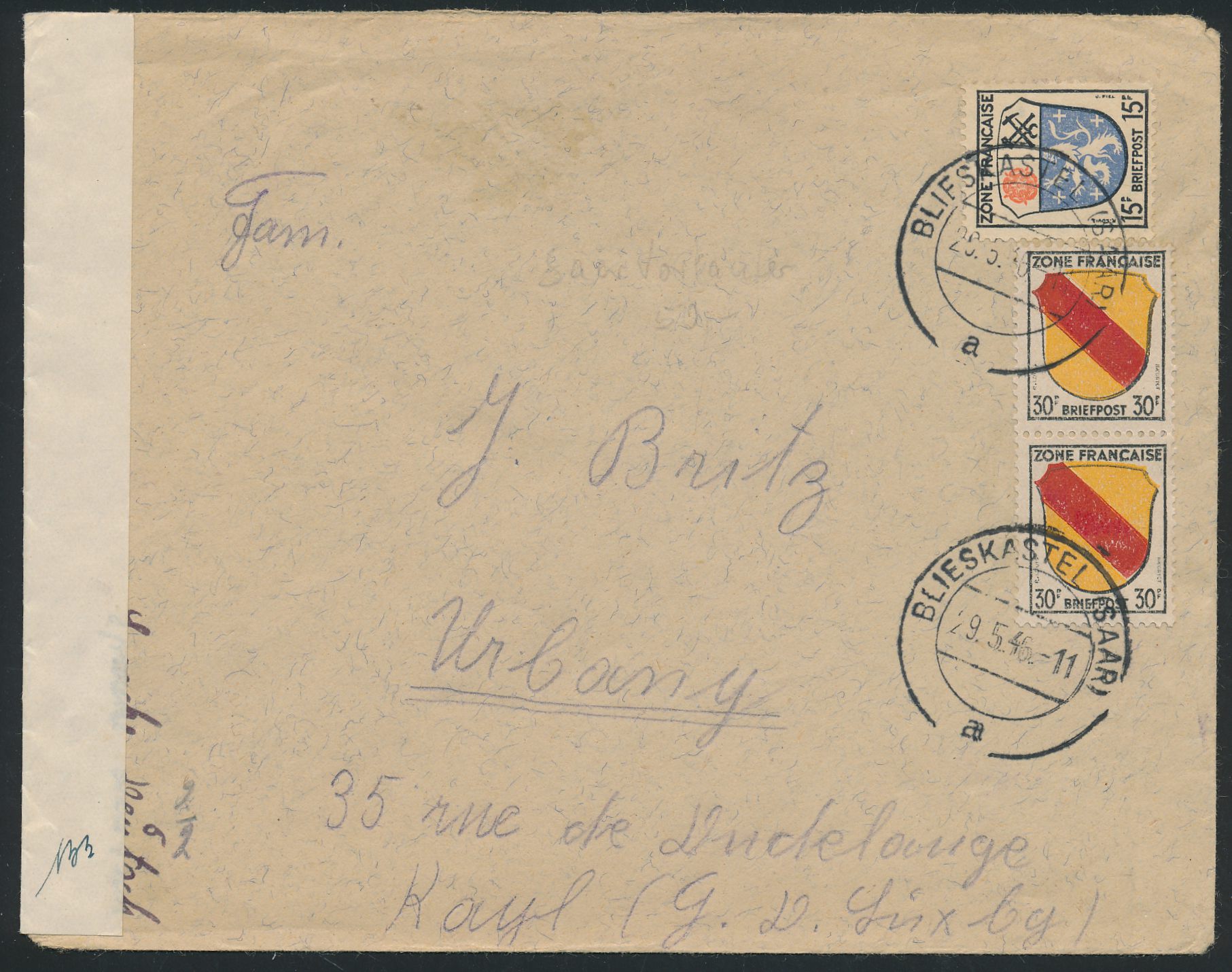 15 Pf. und 2 x 30 Pf. auf Auslandsbrief mit Stempel Blieskastel (Saar) 29.5.46 nach Luxemburg, links weißer Zensurverschlußzettel "Grand-Duché de Luxembourg / Contrôle des Communications Postales" und handschriftliche Zensornummer 133