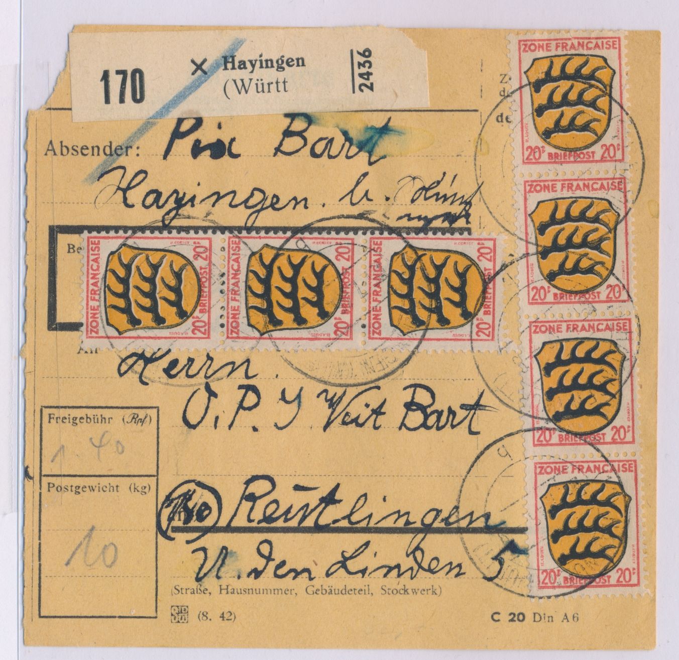 7 x 20 Pf. komplett vorderseitig auf Paketkarte für ein Paket von 10 kg mit Stempel Hayingen (Württ) 5.7.46 nach Reutlingen