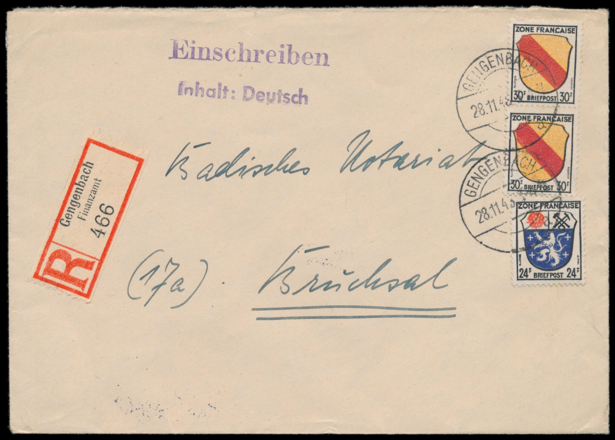 Allgemeine Ausgabe 24 Pf. und 2 x 30 Pf. auf Einschreibbrief mit Stempel Gengenbach 28.11.46 nach Bruchsal, aushilfsweise Verwendung eines Selbstbucher-R-Zettels Gengenbach "Finanzamt" , Ankunftstempel 29.11.46, Bedarf