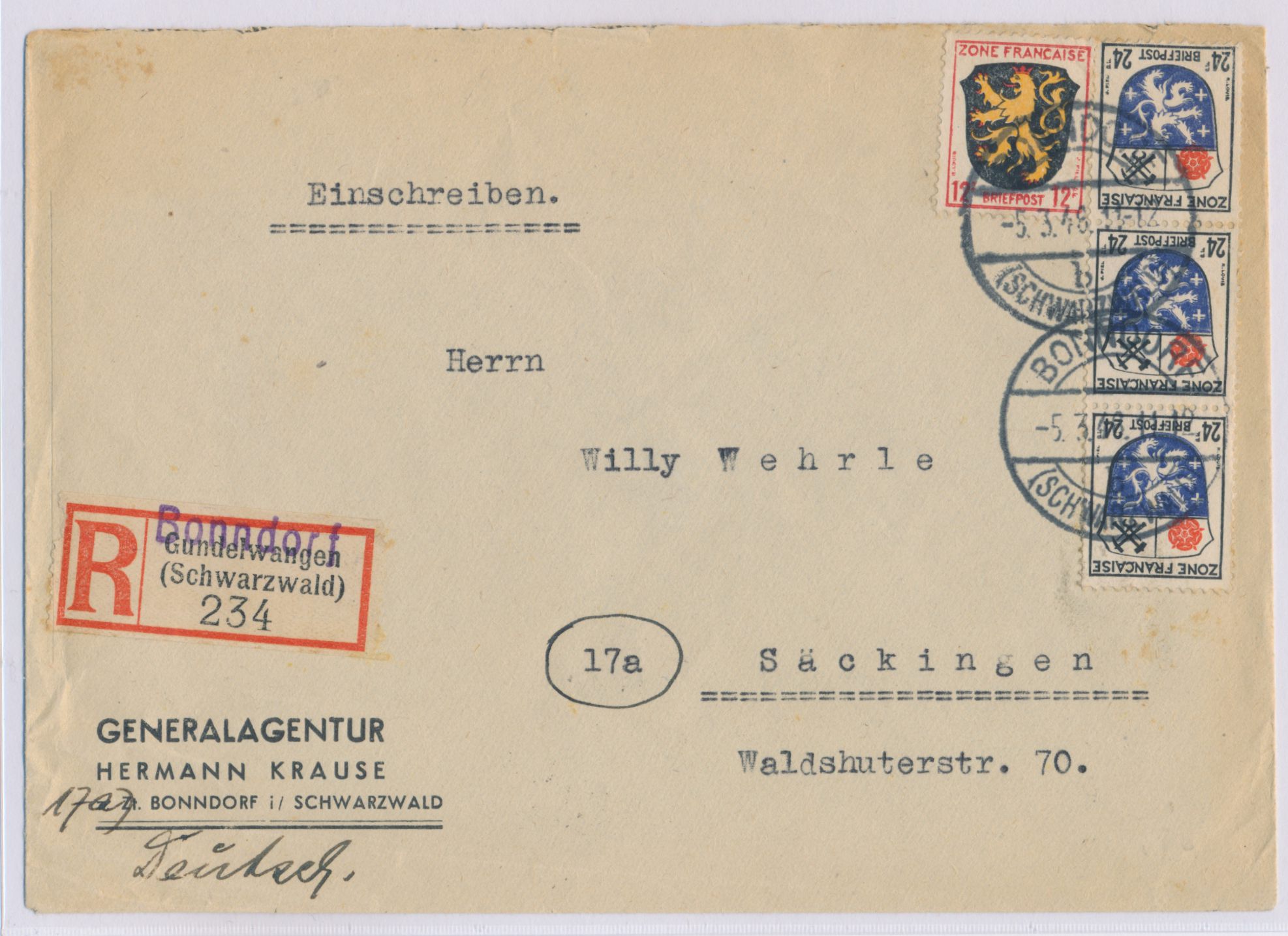 12 Pf. und 3 x 24 Pf. auf Einschreibbrief mit Stempel Bonndorf (Schwarzwald) 5.3.48 nach Säckingen, R-Zettel Gunderwangen (Schwarzwald) mit L1 Bonndorf überstempelt, Ankunftstempel 7.3.46, portorichtig, Bedarf